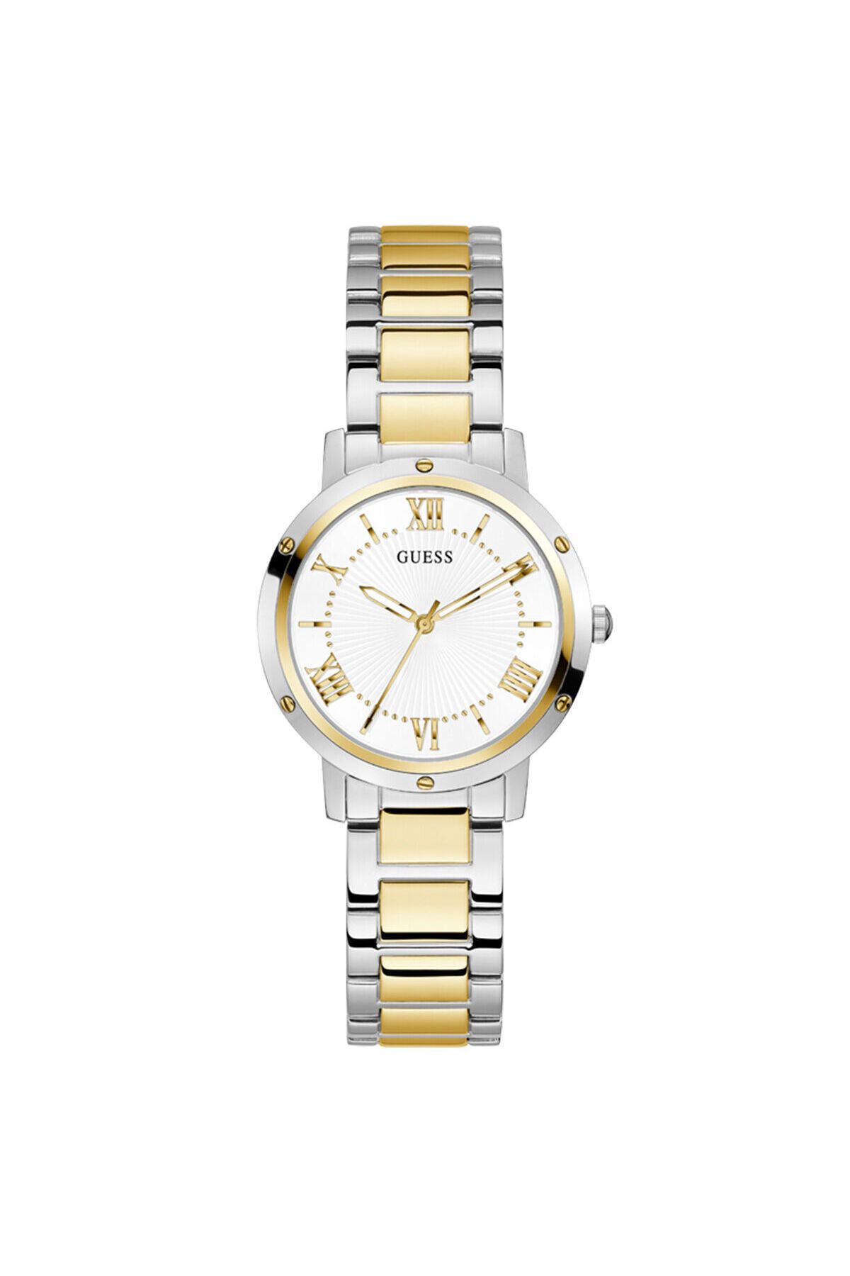 WaterProof:3 ATM CaseDiameter:34 mm CaseThickness:7 mm StrapLanyardColor:Altın Rengi/Metalik Gri DialType:Analog DialColor:Beyaz KasaMateryali:Çelik StrapLanyardProperty:Çelik BrandName:Guess Yaş Grubu:Kadın Gender:Kadın CategoryName:Kadın Klasik Saat Style:Klasik Saatler CaseColor:Metalik Gri GlassProperty:Mineral Technology:Quartz KadranTasi:Yok CaseStone:Yok Alarm:Yok DialStone:Yok Calendar:Yok Kronometre:Yok CaseShape:Yuvarlak