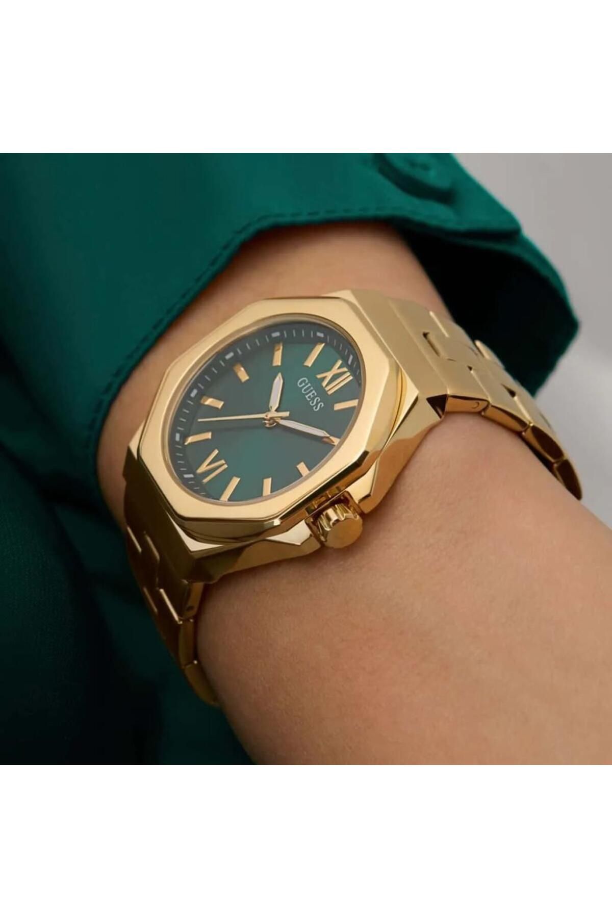 CaseDiameter:34 mm WaterProof:5 ATM CaseThickness:9 mm CaseColor:Altın Rengi StrapLanyardColor:Altın Rengi DialType:Analog KasaMateryali:Çelik StrapLanyardProperty:Çelik Mensei:Filipinler BrandName:Guess Yaş Grubu:Kadın Gender:Kadın CategoryName:Kadın Klasik Saat Style:Klasik Saatler GlassProperty:Mineral Technology:Quartz DialColor:Yeşil Alarm:Yok DialStone:Yok Calendar:Yok Kronometre:Yok KadranTasi:Yok CaseStone:Yok CaseShape:Yuvarlak