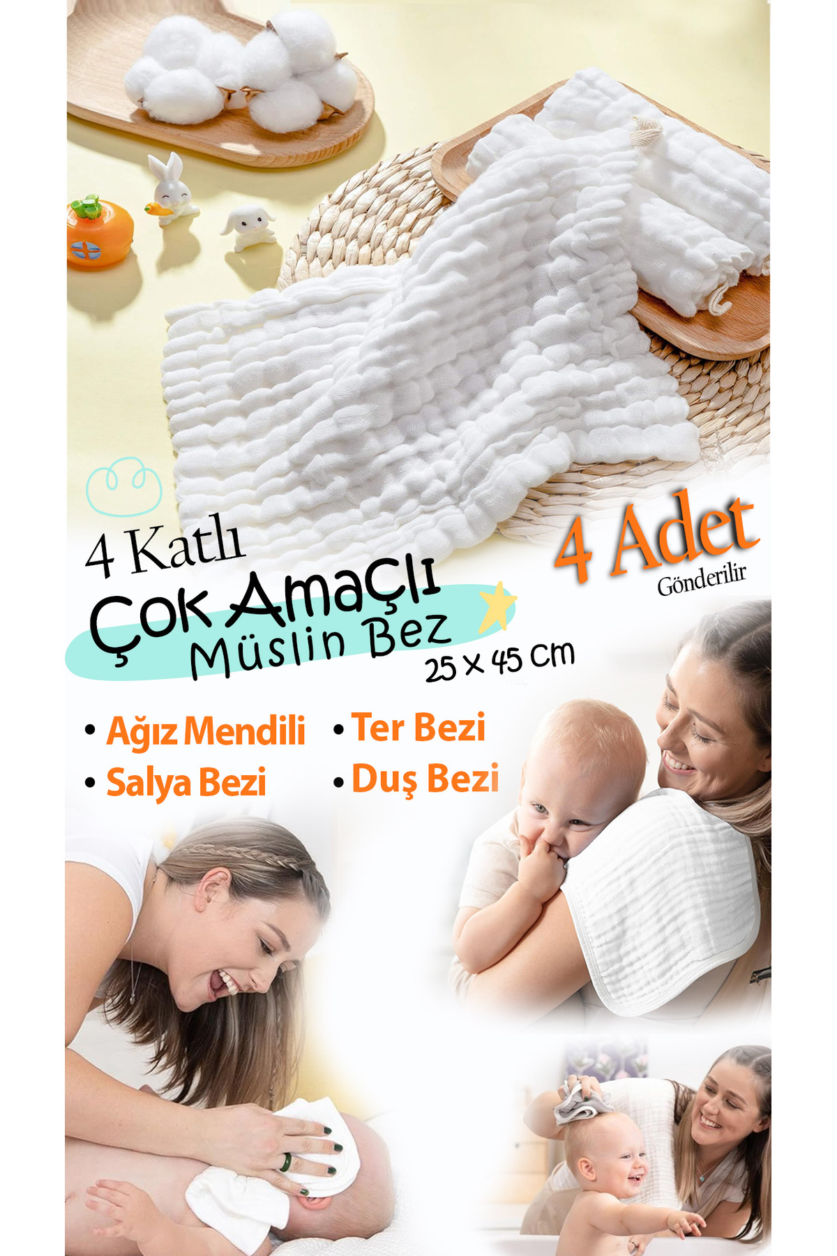 HALZEY 4'lü Ağız Mendili, Salya Bezi, Bebek Ter Bezi, Bebek Duş Bezi %100 Pamuk 4 katlı Müslin Bez 25x45 Cm ürünü ucuz fiyat, hızlı kargo imkanı ile hemen sitemizden sipariş verin.