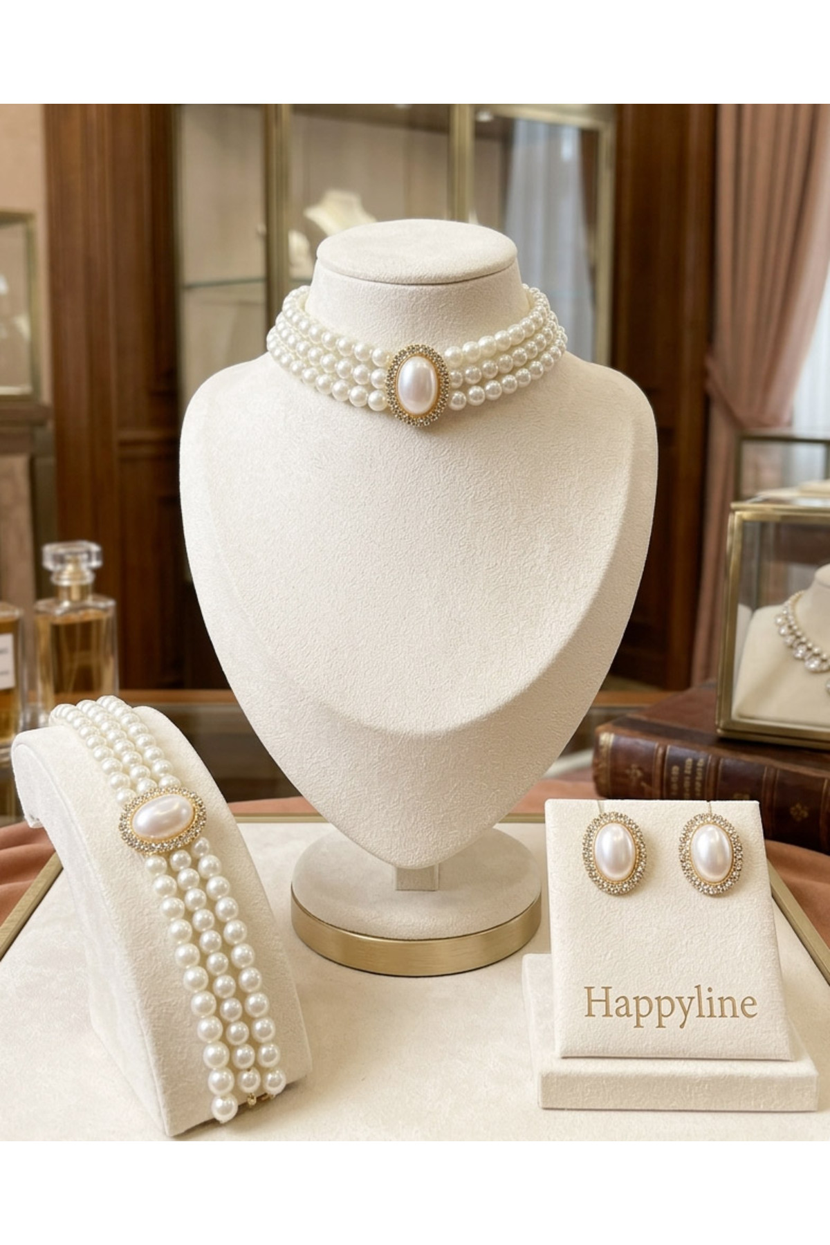 Happyline İncili taşlı gold kaplama inci tasma choker kolye tasarım kolye şık kolyeset küpe bileklik takım