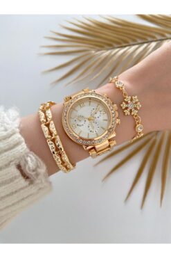 Arzu Butik Gold Renk Metal Kordon Kadın Kol Saati Ve Kombin Bileklik Seti