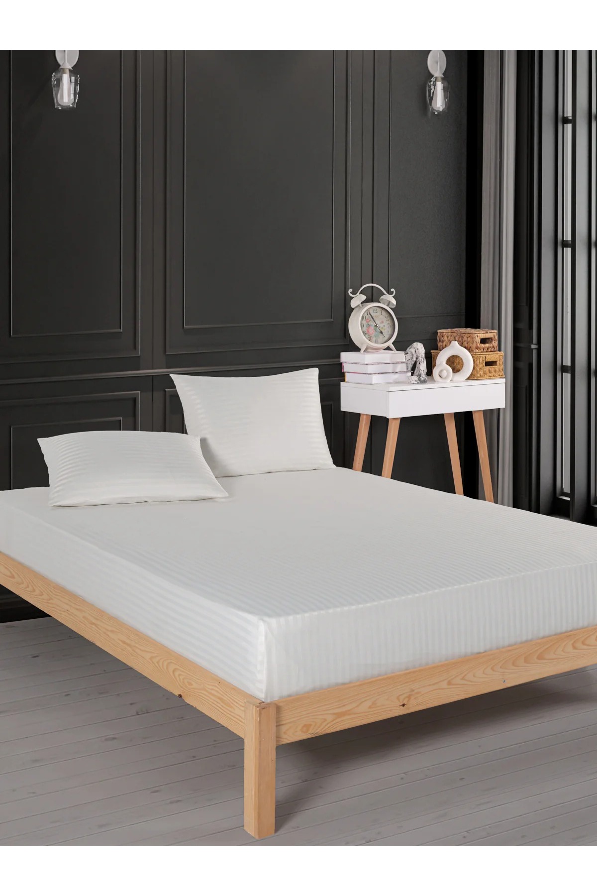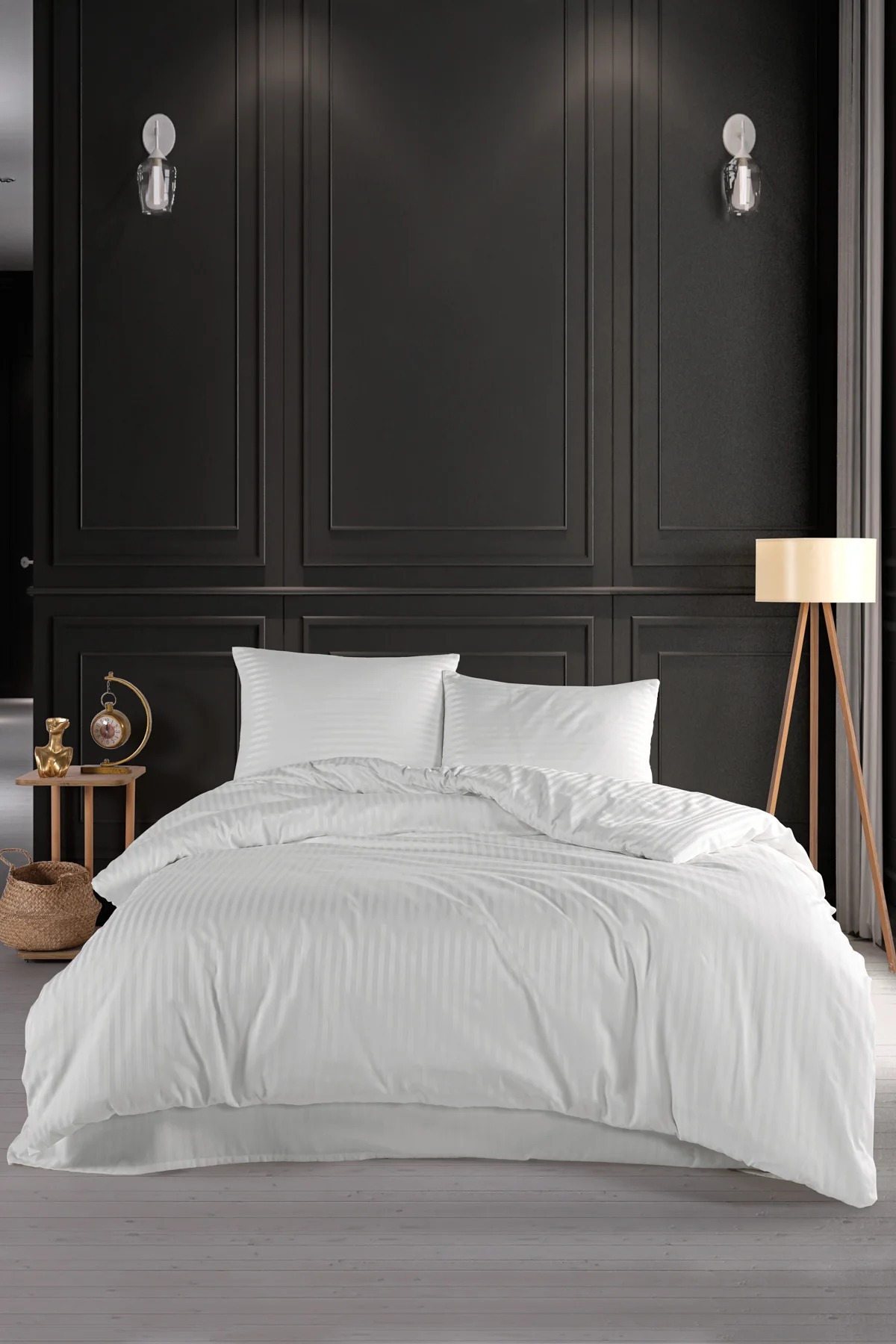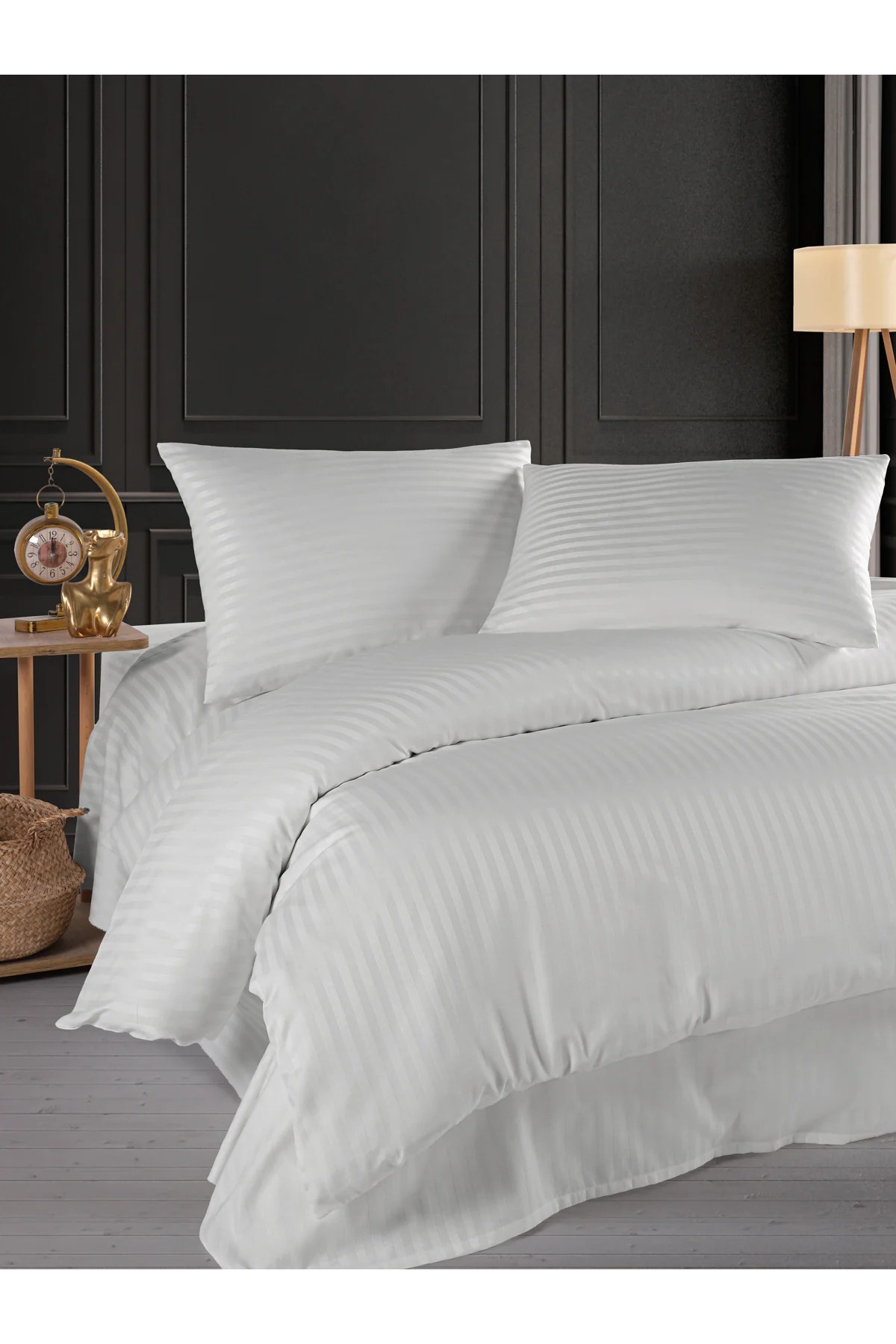 Home Çift Kişilik Çizgili Saten Nevresim Takımı Beyaz