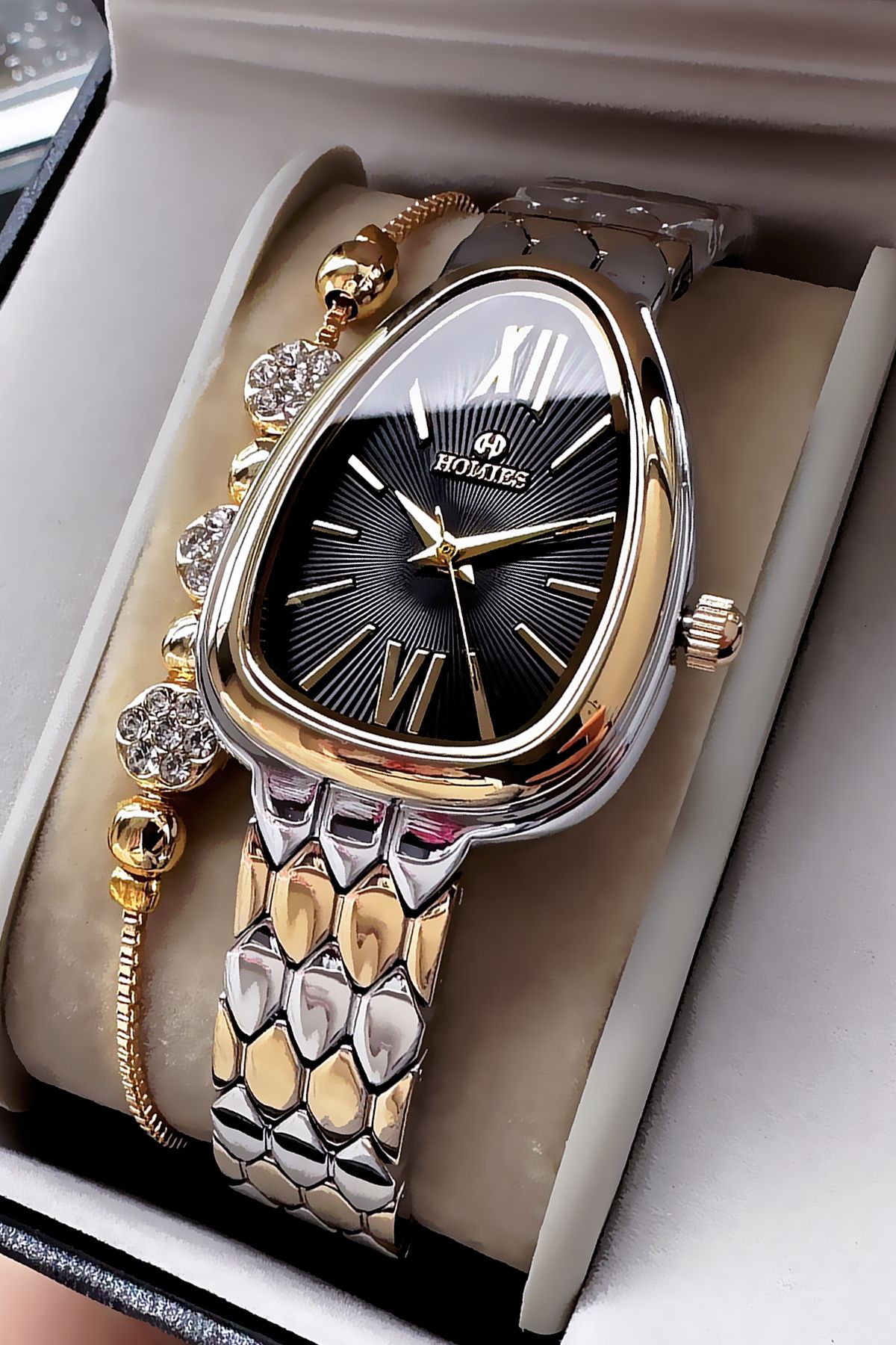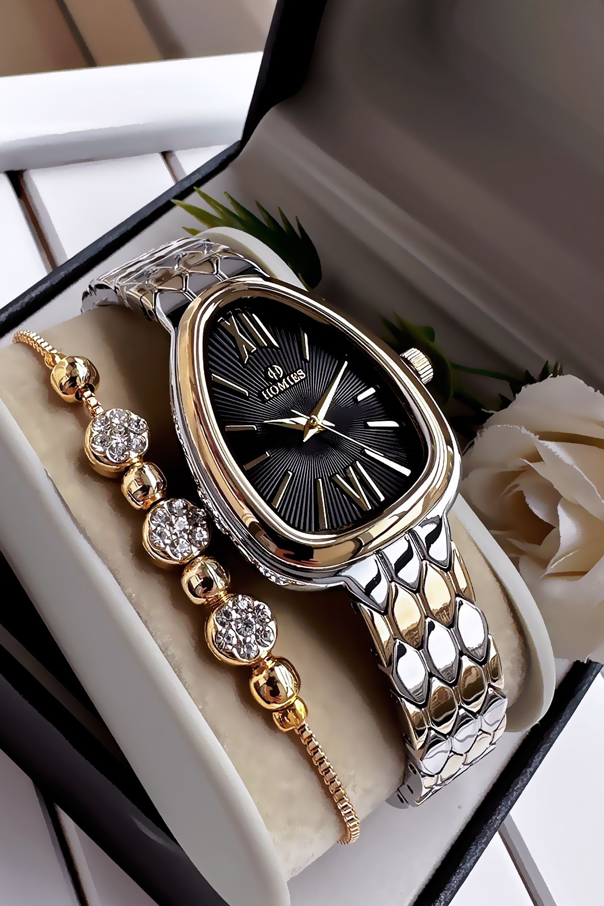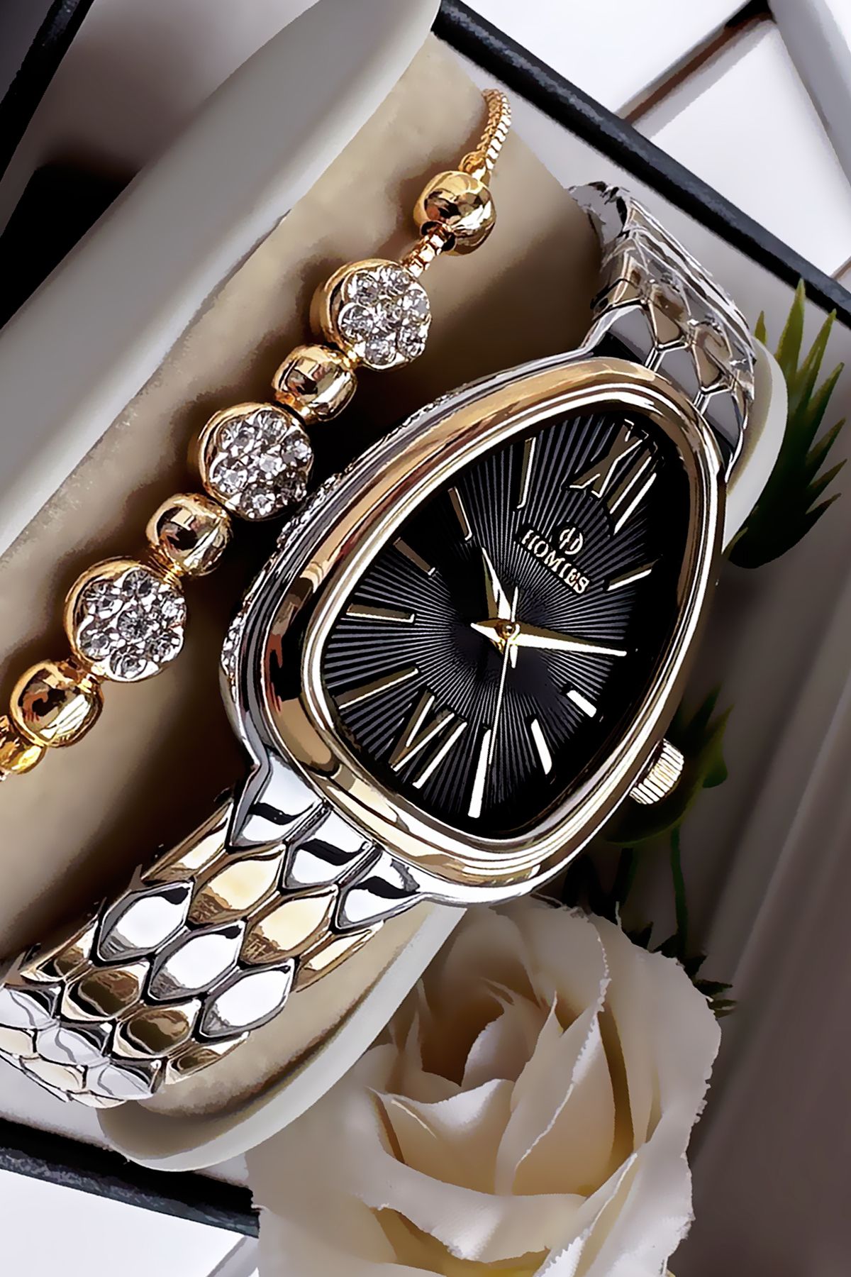 Homies Özel Kutulu Yılan Modeli Kadın Kol Saati Su Geçirmez iki Renk Çelik Kordon + Bileklik HMBY2059C3