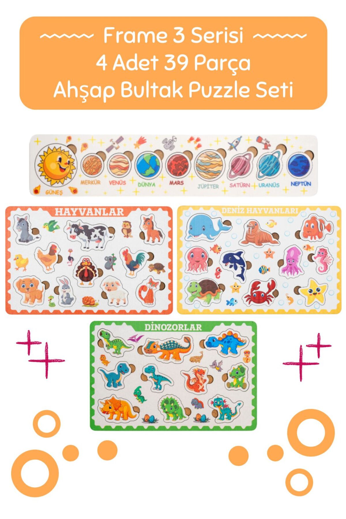 Hopiers Montessori Frame 3 Bultak Ahşap Puzzle Seti / Eğitici ve Zeka Geliştirici Oyuncak