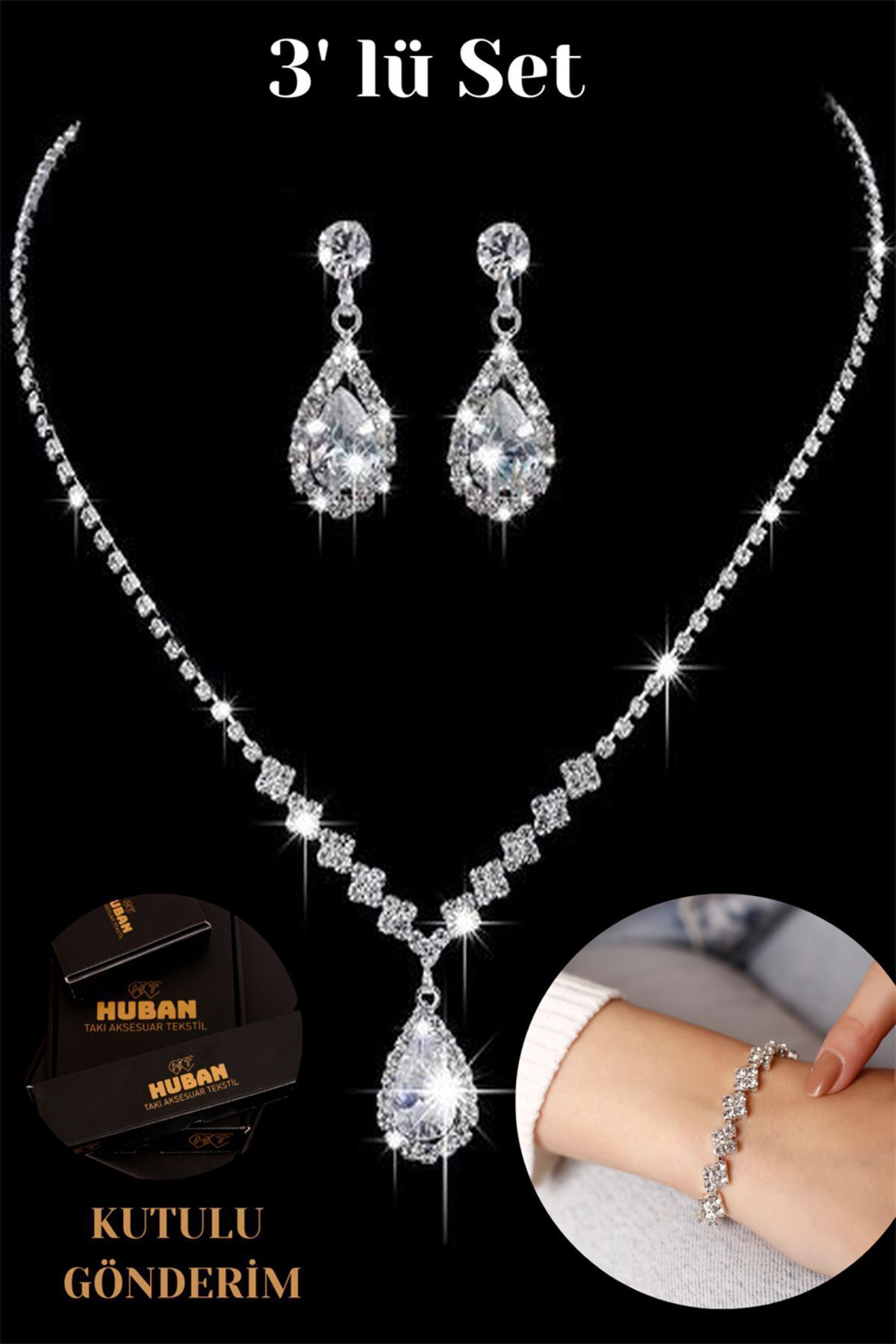 HUBANN Pırlanta Görünümlü Su Yolu Zirkon Taşlı 3’lü Set Kolye Küpe Bileklik VIP Abiye Nişan Gelin Takı Seti