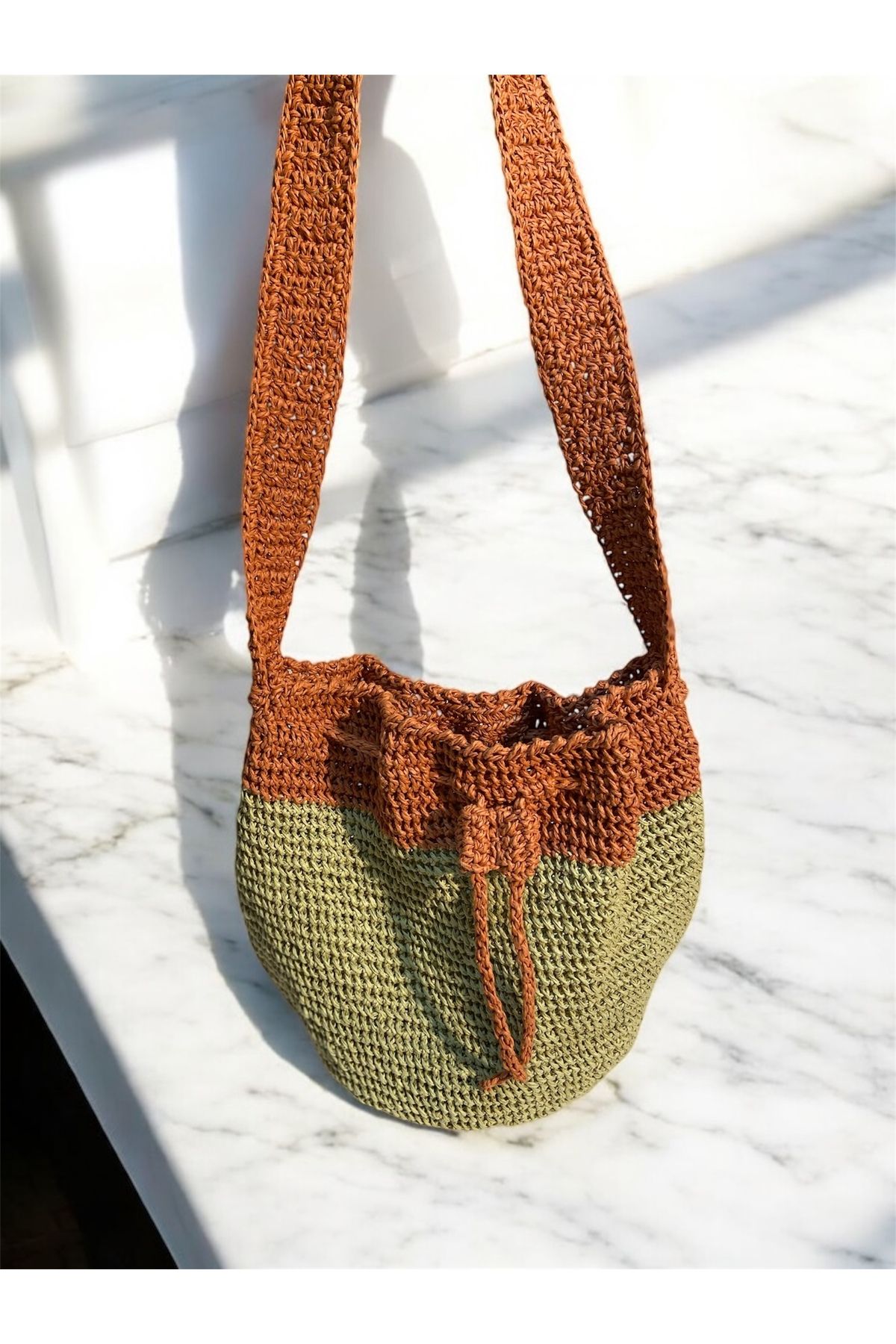 El örgüsüyle üretilmiş bu şık omuz çantası, doğal dokusu ve modern tasarımıyla her ortamda rahatlıkla kullanılabilir.