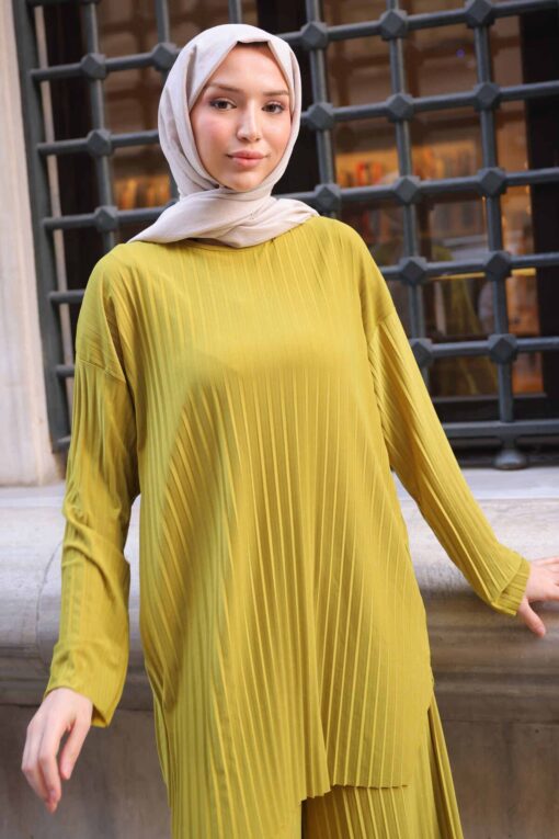 İmajButik Yağ Yeşili Piliseli Sandy Tunik Pantolon Takım