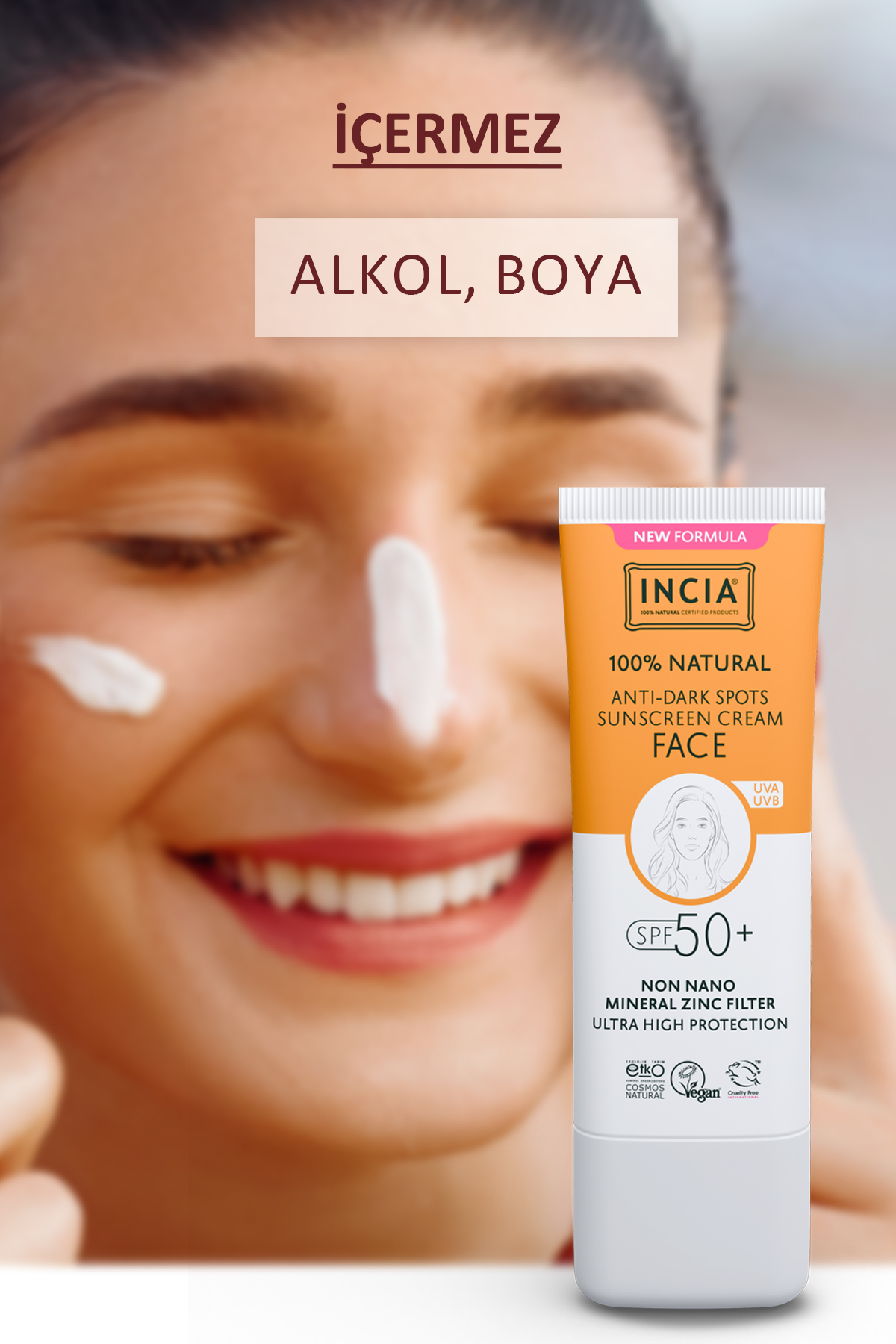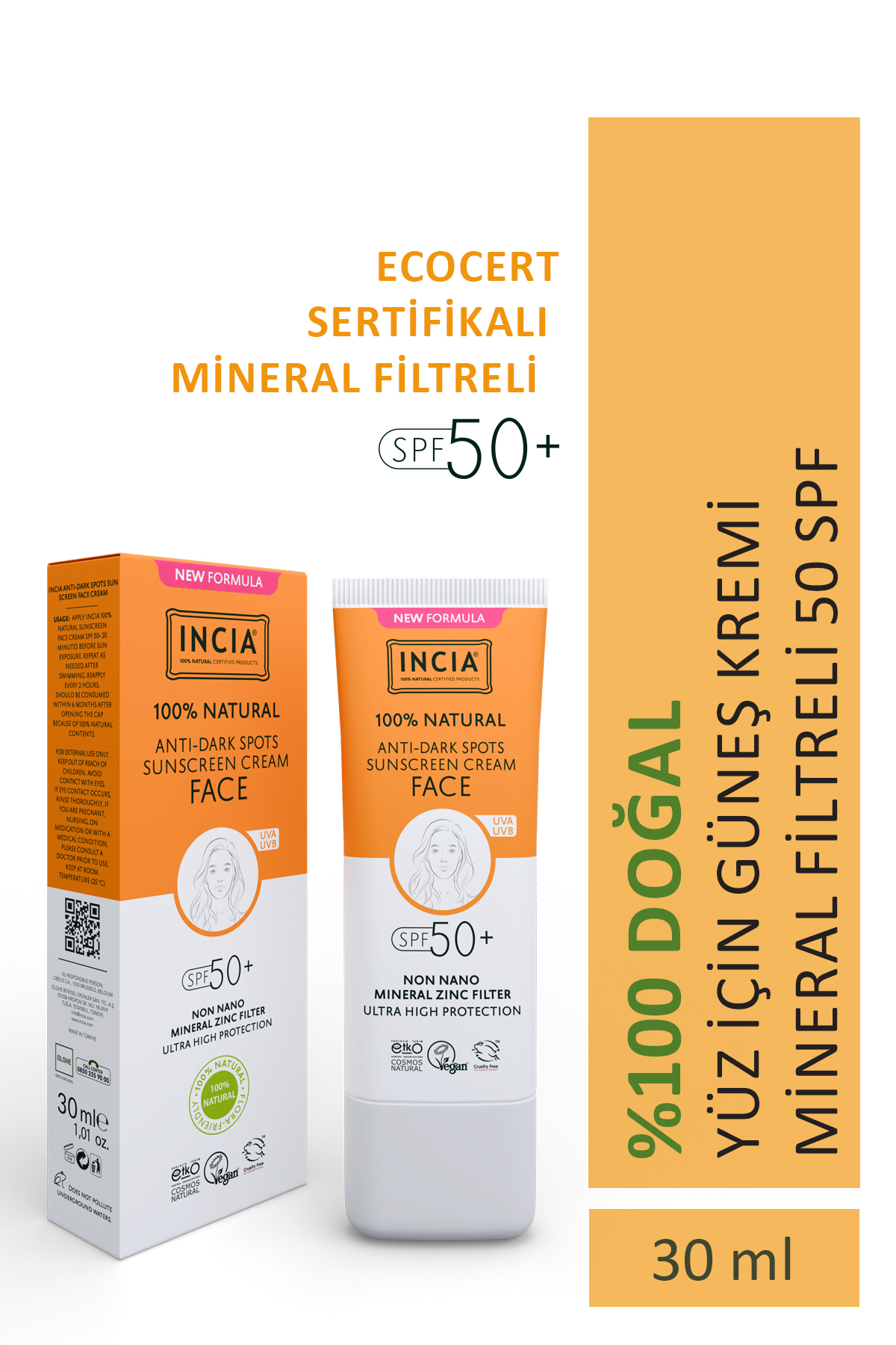 Incia %100 Doğal Yüz Güneş Kremi Leke Karşıtı Aydınlatıcı Mineral Filtre UVA1 UVA2 UVB SPF 50+ 30 ml ürünü ucuz fiyat, hızlı kargo imkanı ile hemen sitemizden sipariş verin.