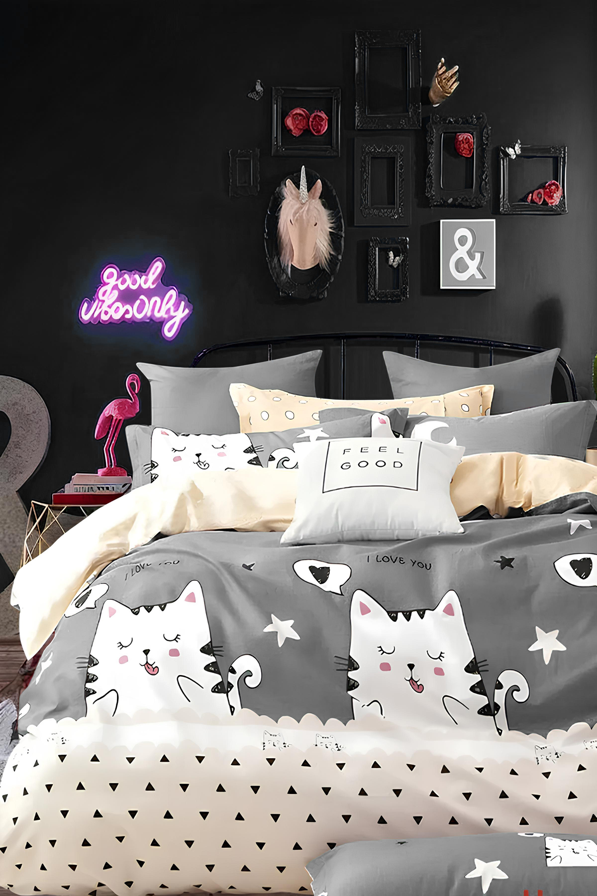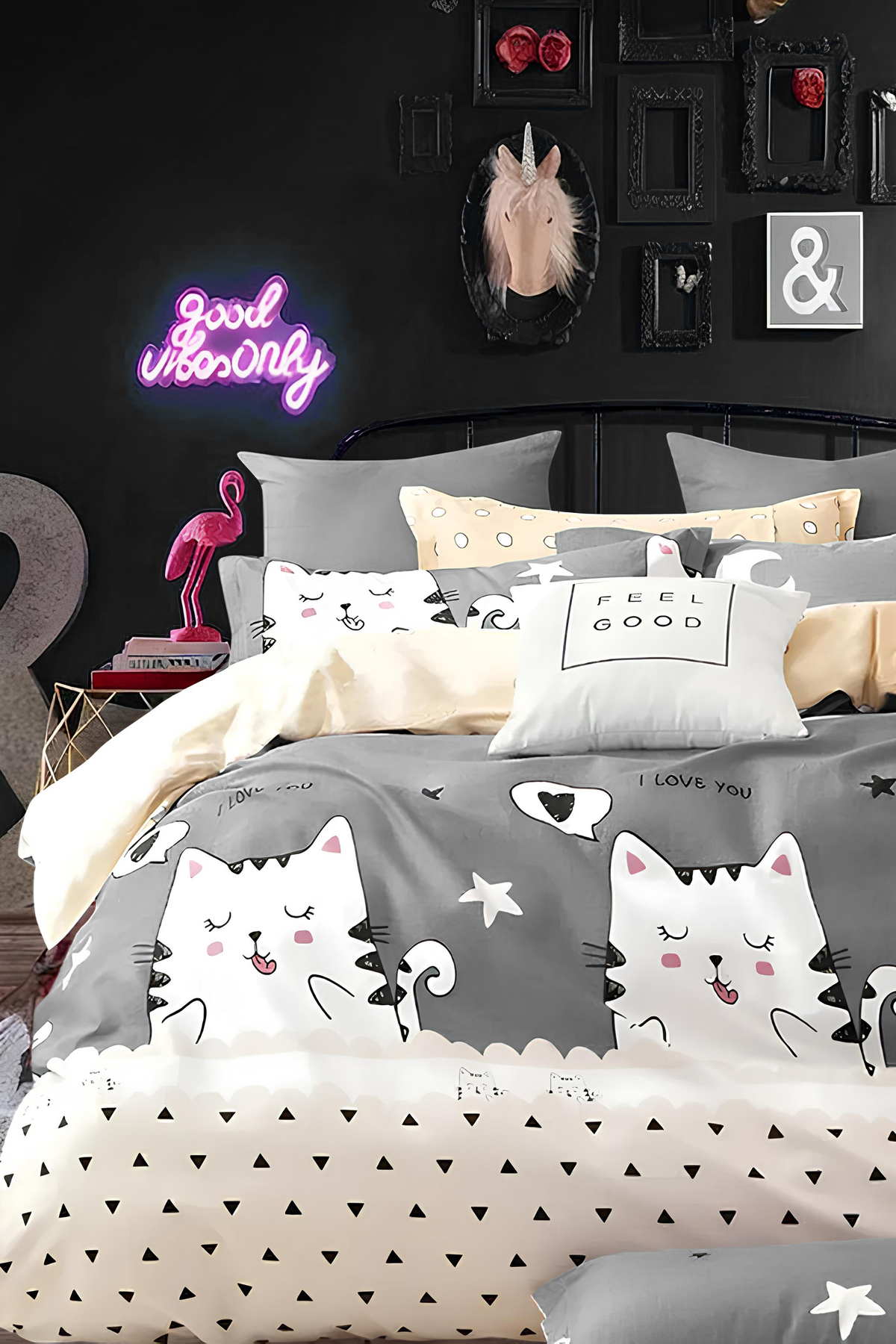 İQON Lastikli Çarşaflı Nevresim Takımı Tek Kişilik Sevimli Kediler Gri