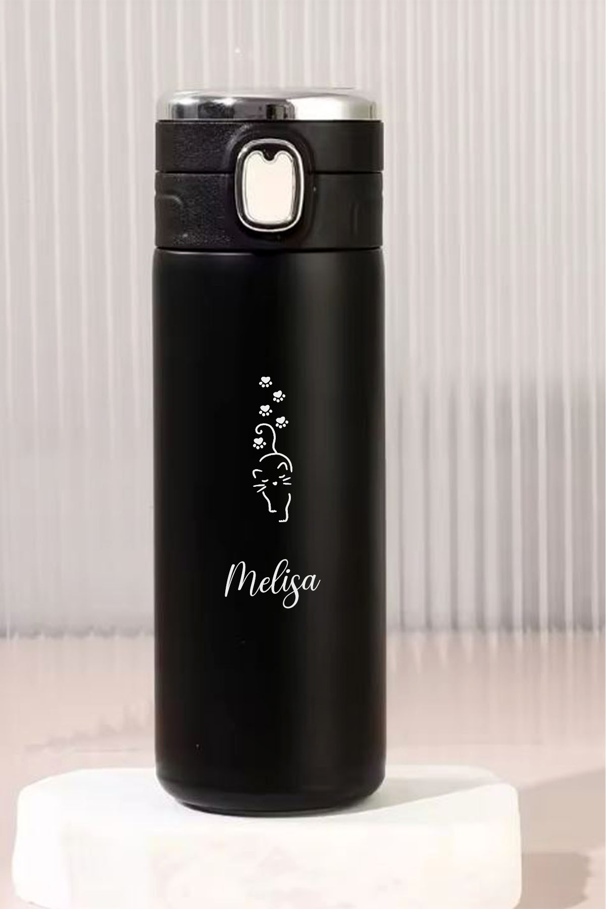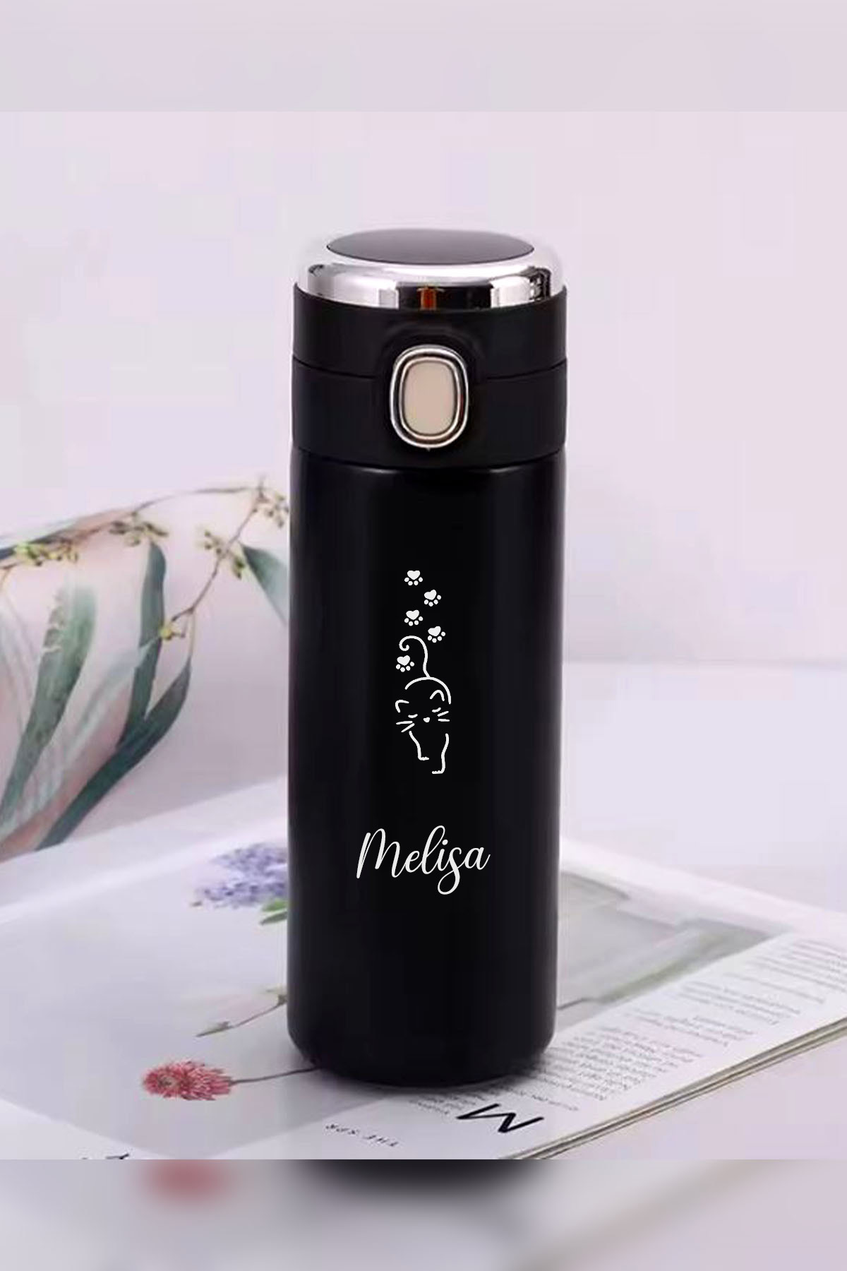 İŞTE BU Kişiye Özel 450 ML Dijital Isı Göstergeli Kilitli Kapaklı Kedi Baskılı Paslanmaz Çelik Termos