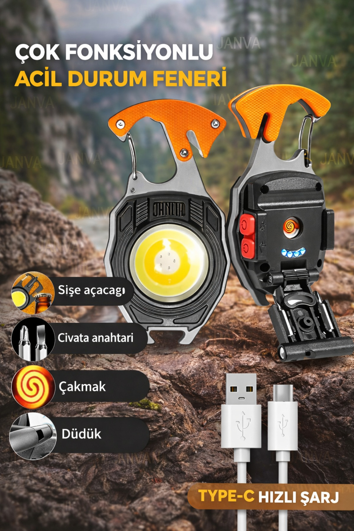 Janva Kamp Feneri Çok Fonksiyonlu Fener Anahtarlık Usb Çakmak Cam Kırıcı Kesici Düdük Tornavida Açacak ürünü ucuz fiyat, hızlı kargo imkanı ile hemen sitemizden sipariş verin.