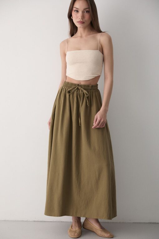 JASTE Kadın Koyu Haki Beli Lastikli Çift Cepli Keten Etek