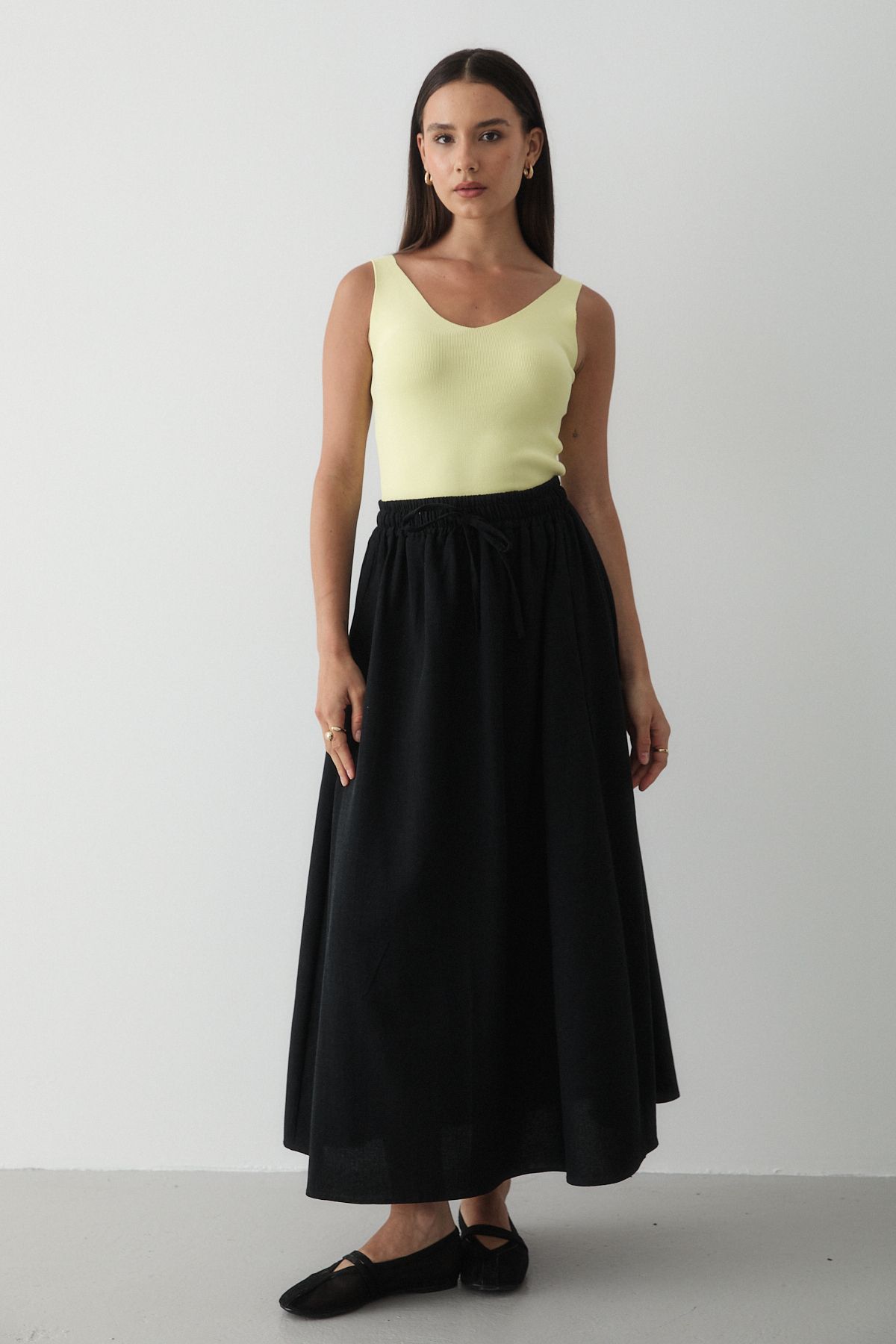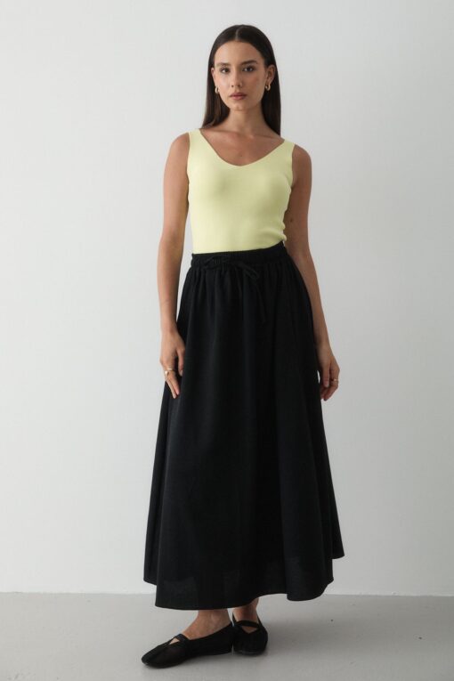 JASTE Kadın Siyah Beli Lastikli Çift Cepli Keten Etek