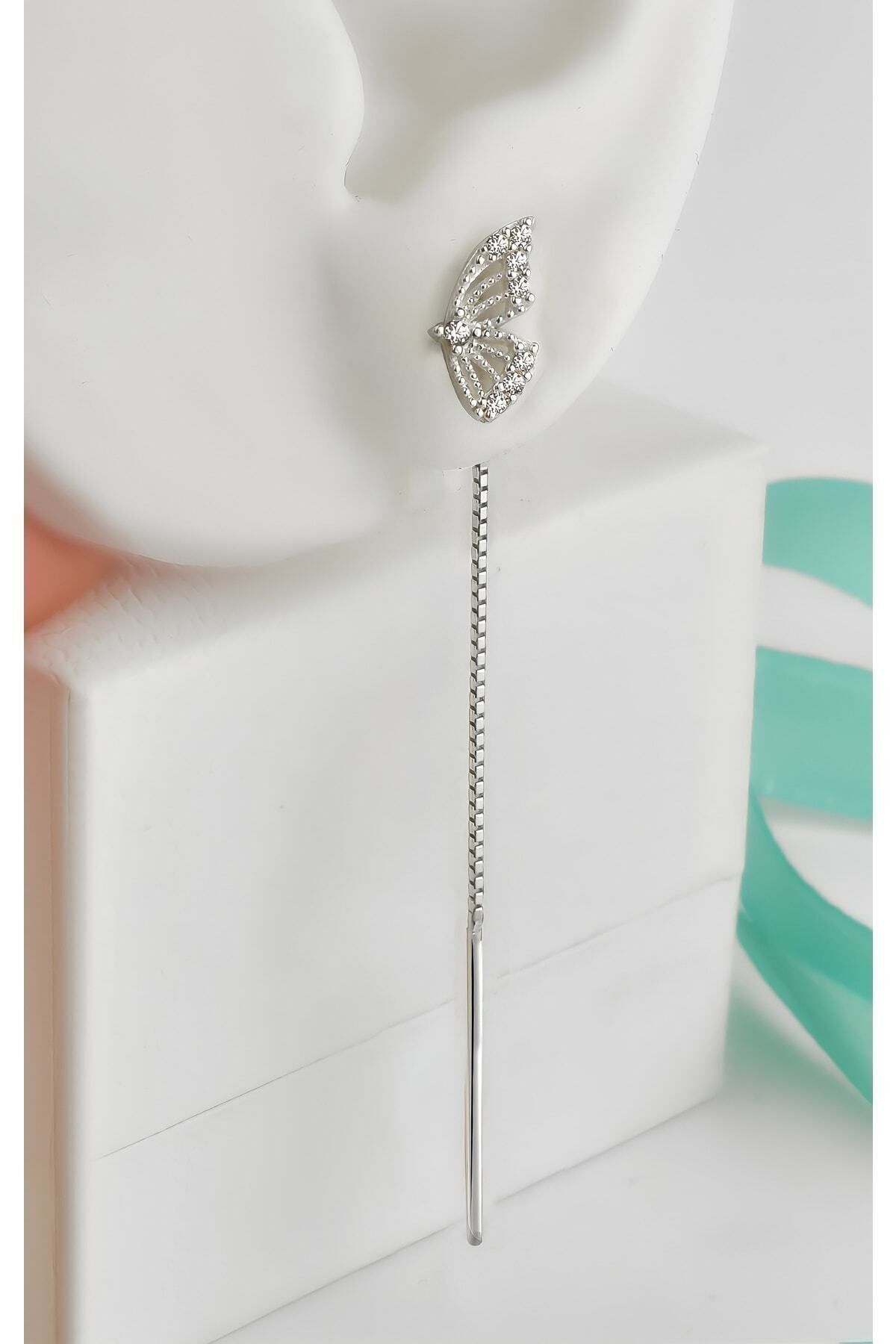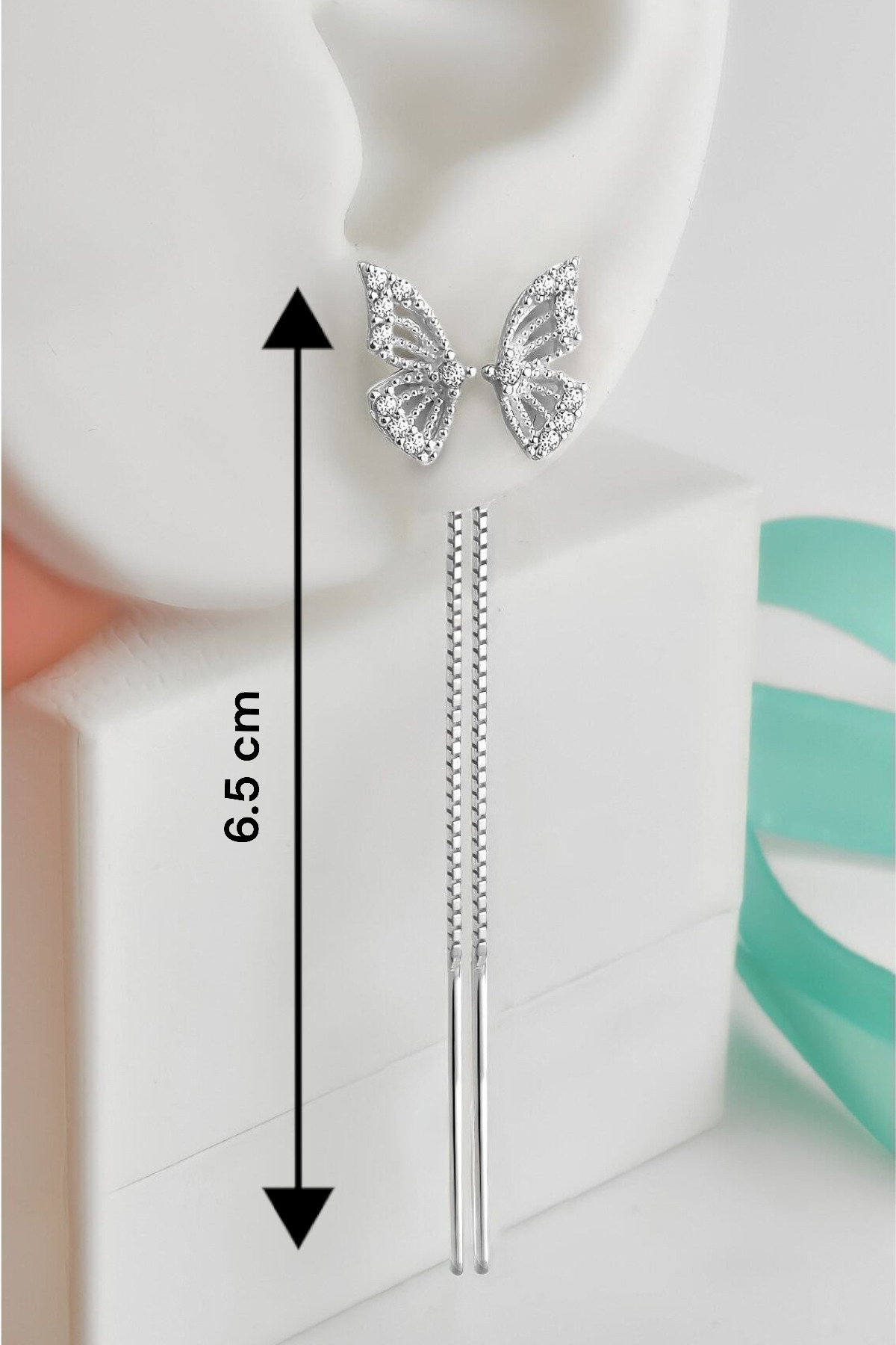 jelux silver Gümüş 925 Ayar Rodyumlu Kelebek Model Zirlon Taşlı Zincirli Küpe