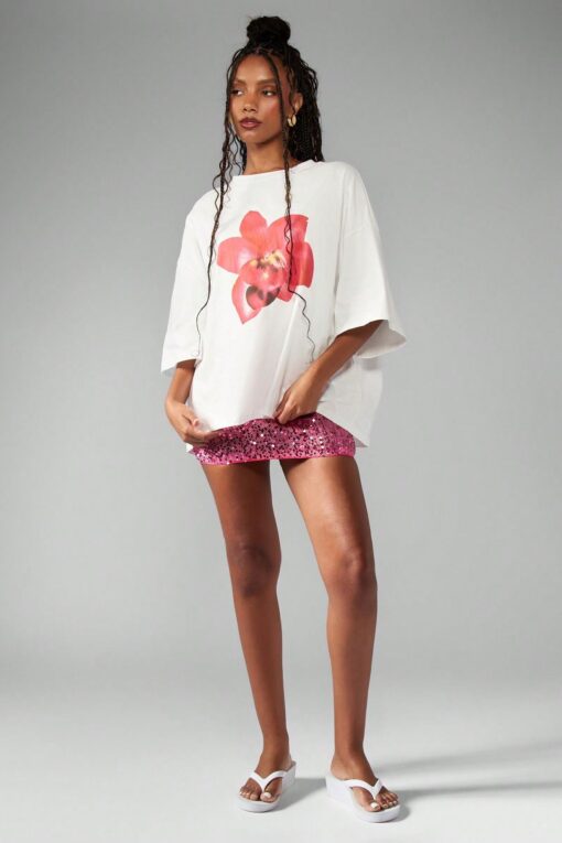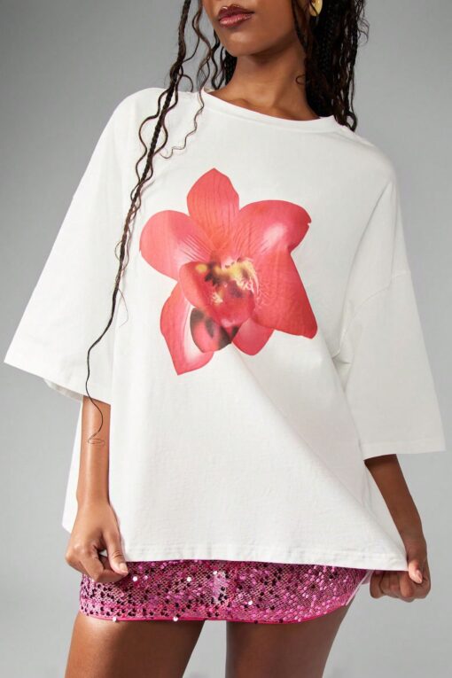 KASHKHA Orkide Çiçeği Baskılı %100 Pamuk Kadın Oversize Beyaz Tişört