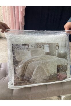 Kelebek Çift Kişilik Dantelli Battaniye Yatak Örtüsü Takımı Krem Rengi Fermuarlı Çantasında