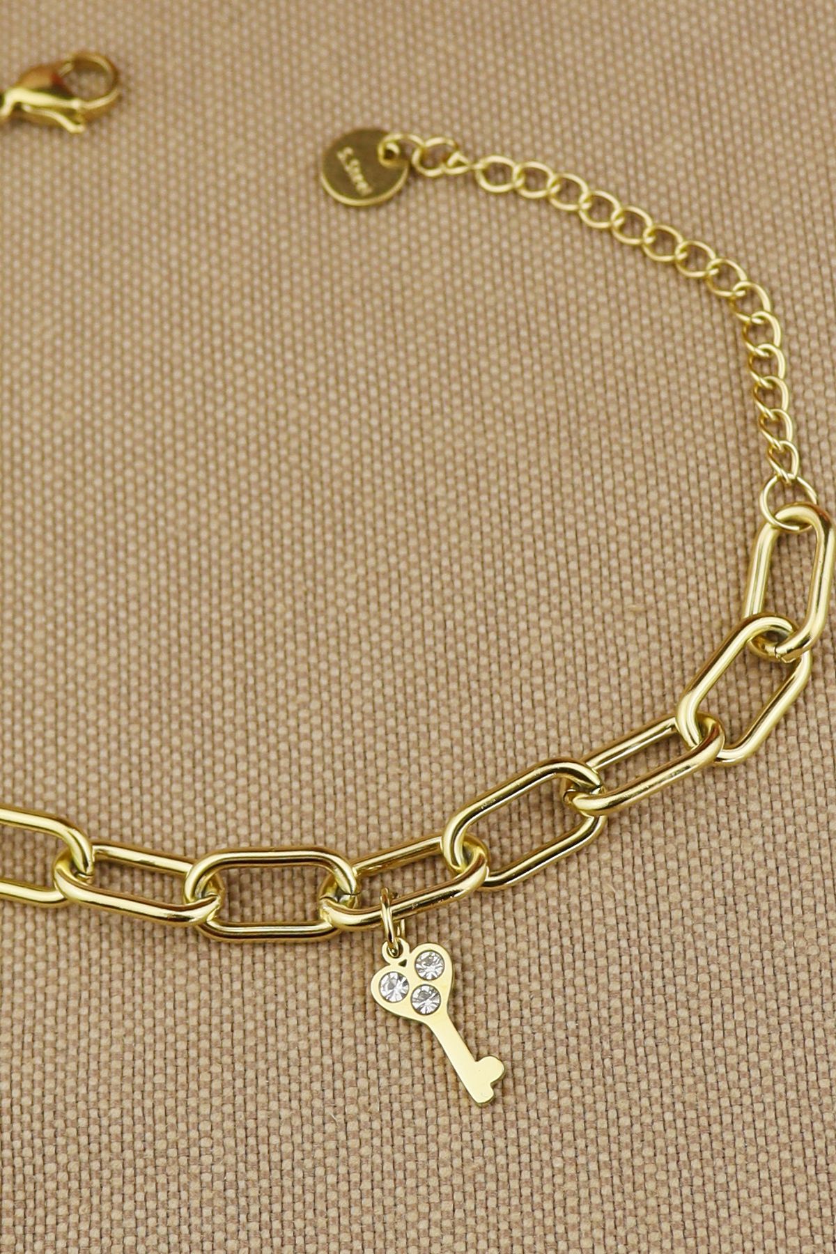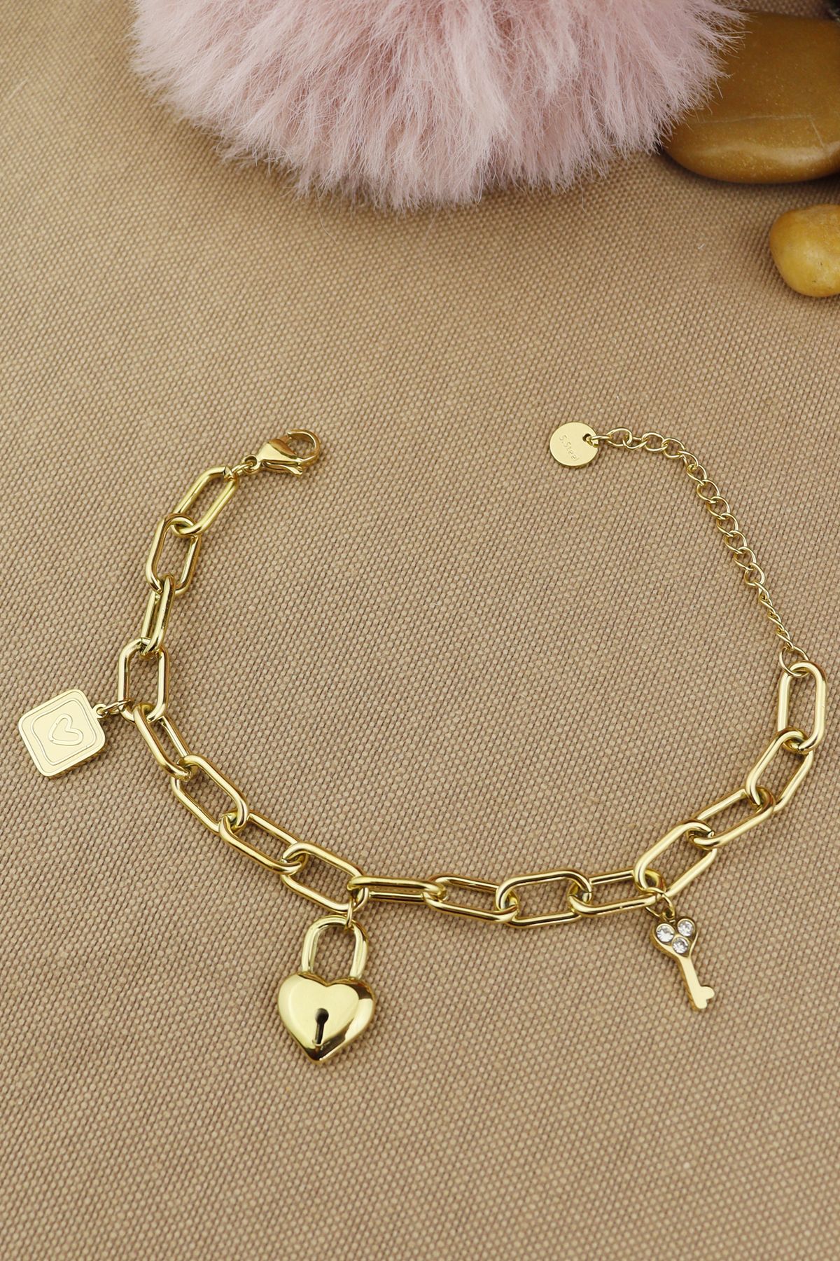 Keyifli Hayaller Çelik Bileklik - Kalp Anahtar Charmlı 316L Çelik Ataç Halka Zincir Bileklik Kararmaz Solmaz 17+5 cm