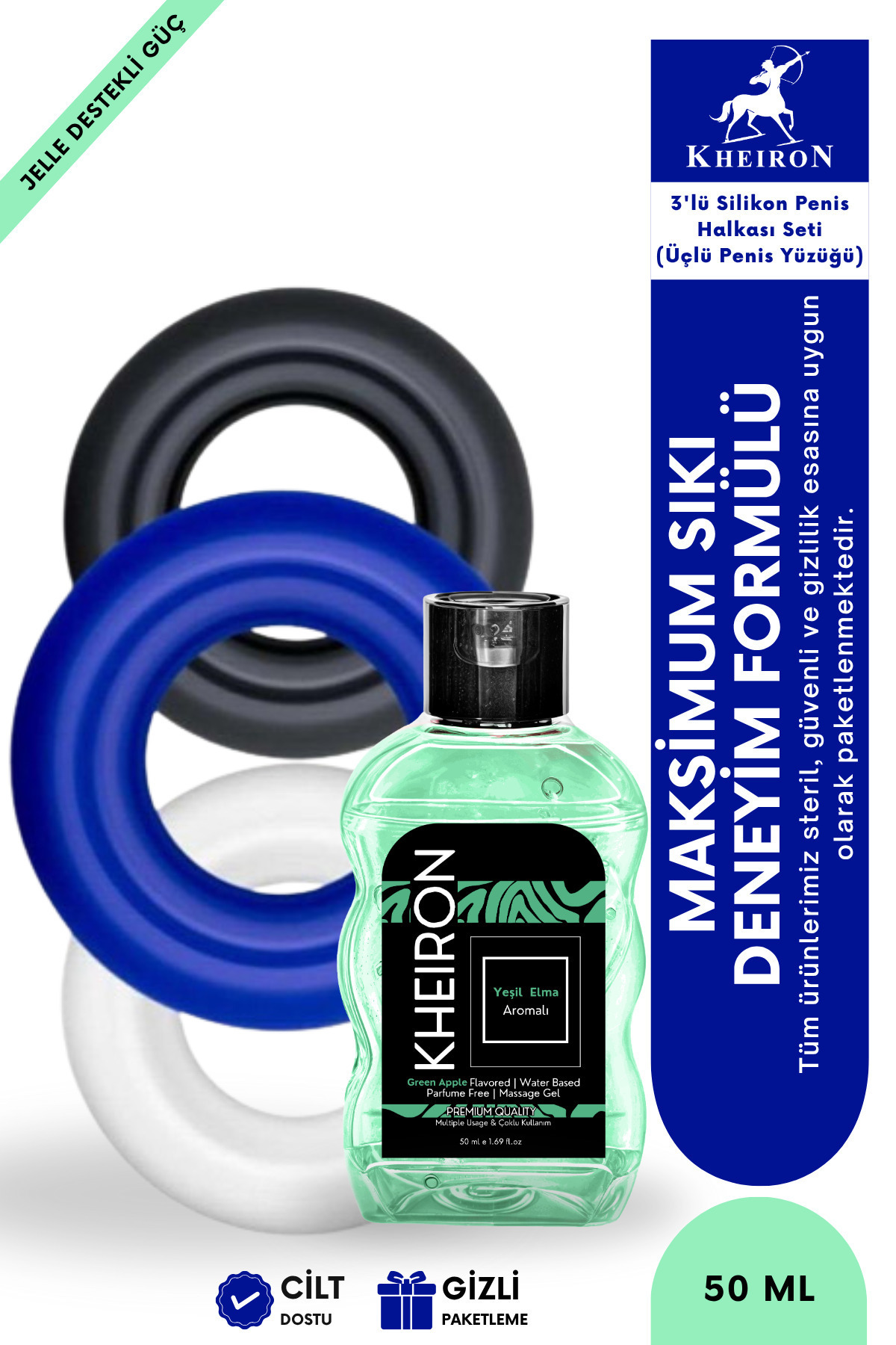 kheiron 3’lü Silikon Penis Halkası Seti + Yeşil Elma Aromalı 50 ml Su Bazlı Masaj Jeli ürünü ucuz fiyat, hızlı kargo imkanı ile hemen sitemizden sipariş verin.