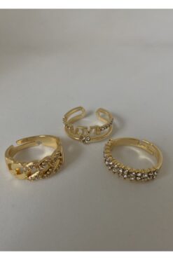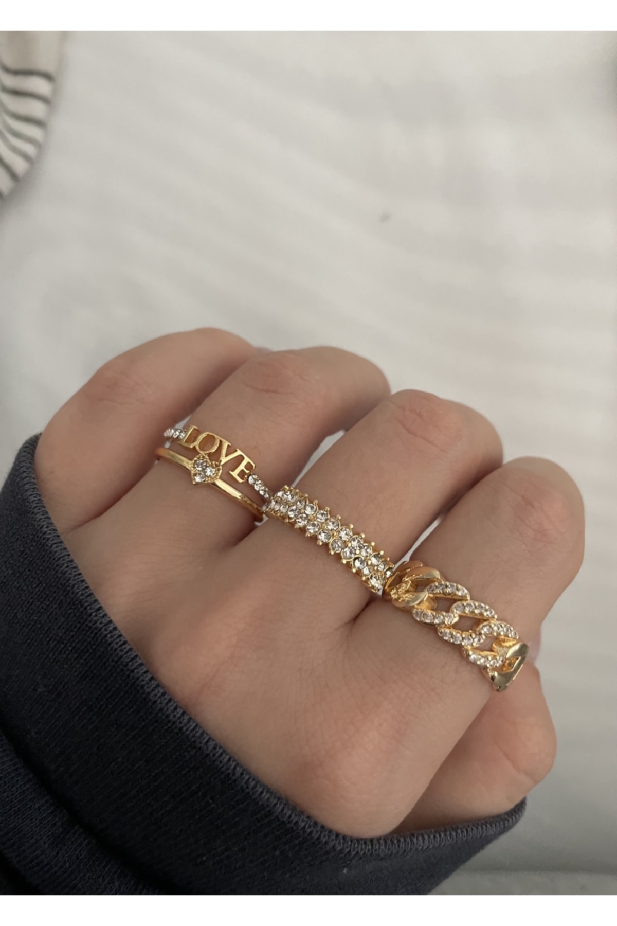 KİLİGİSTANBUL Gold Love&zincir 3’lü Yüzük Seti