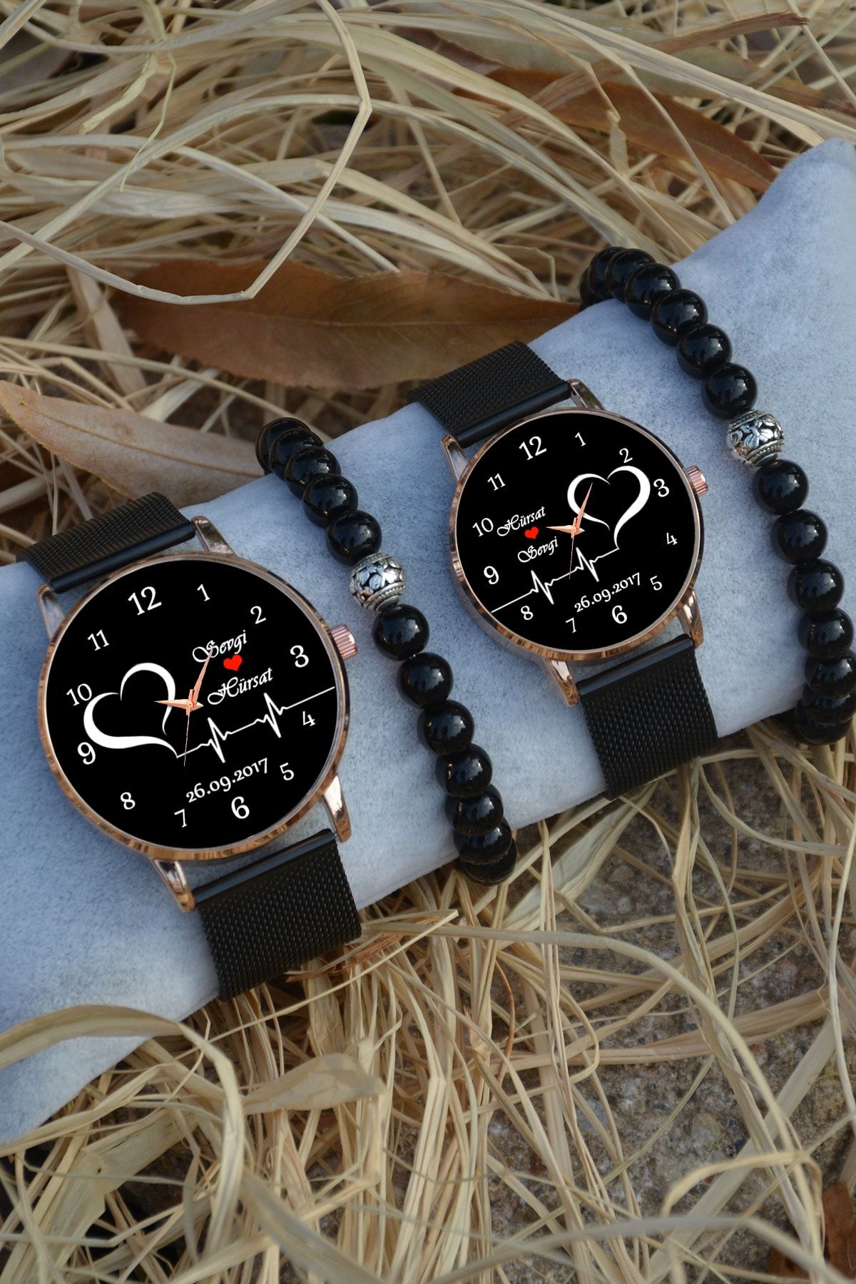 Kubbehan Sevgili Saatleri Siyah Kalp Isim Ve Tarih Yazılı Çift Kol Saatleri