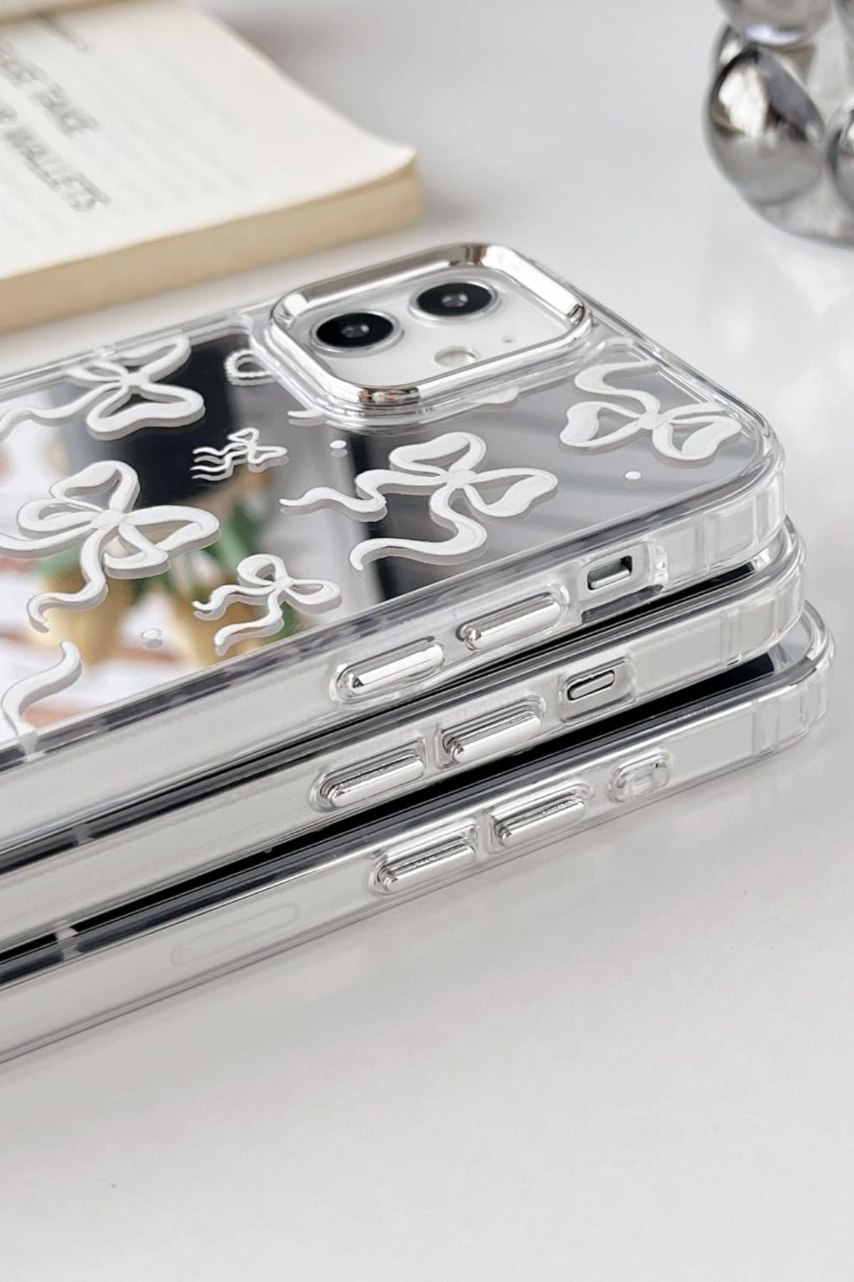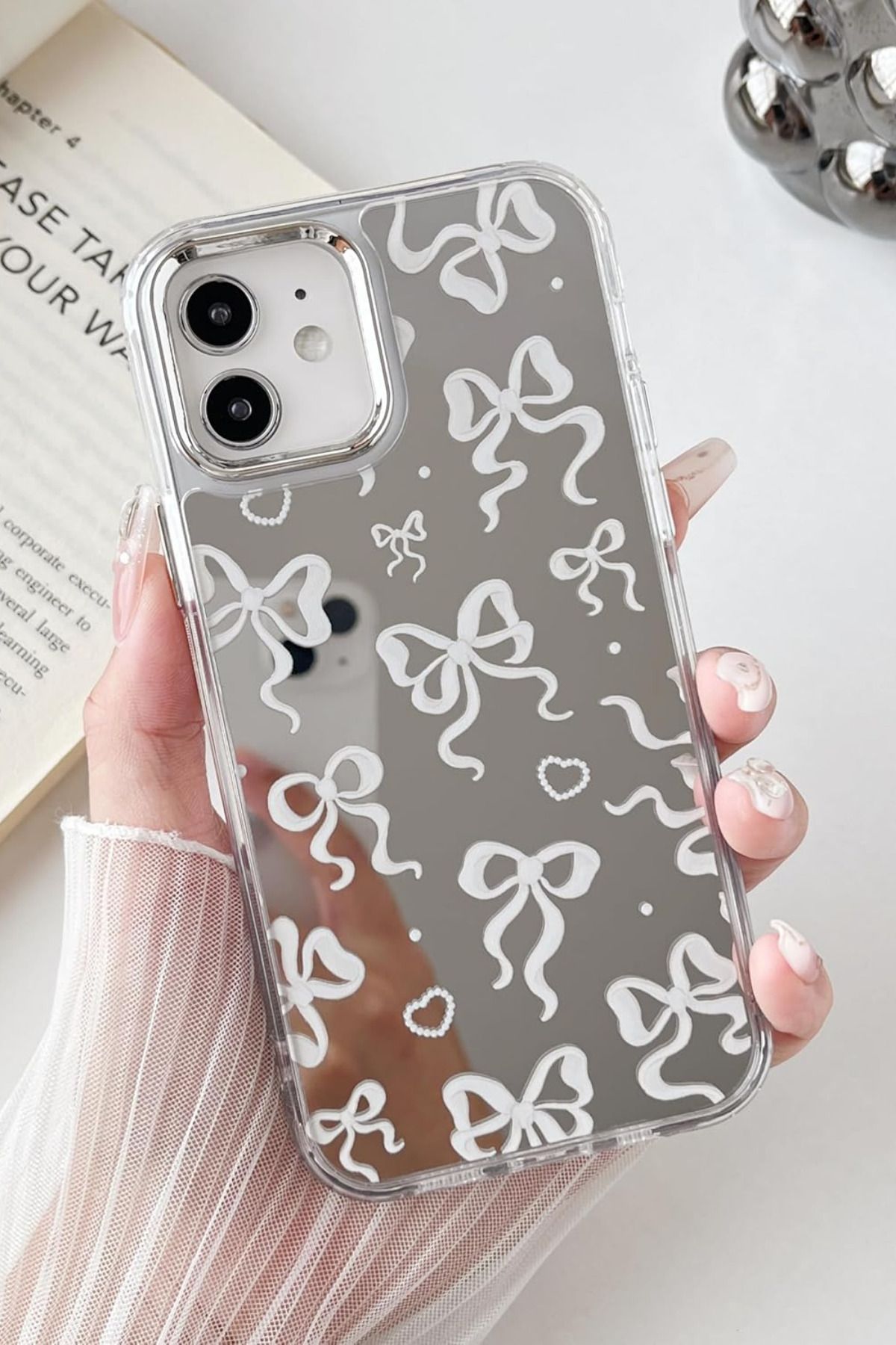 KVK PRİVACY Apple iPhone 11 Uyumlu Aynalı Kılıf Beyaz Fiyonk Desenli Darbelere Dayanıklı Kapak