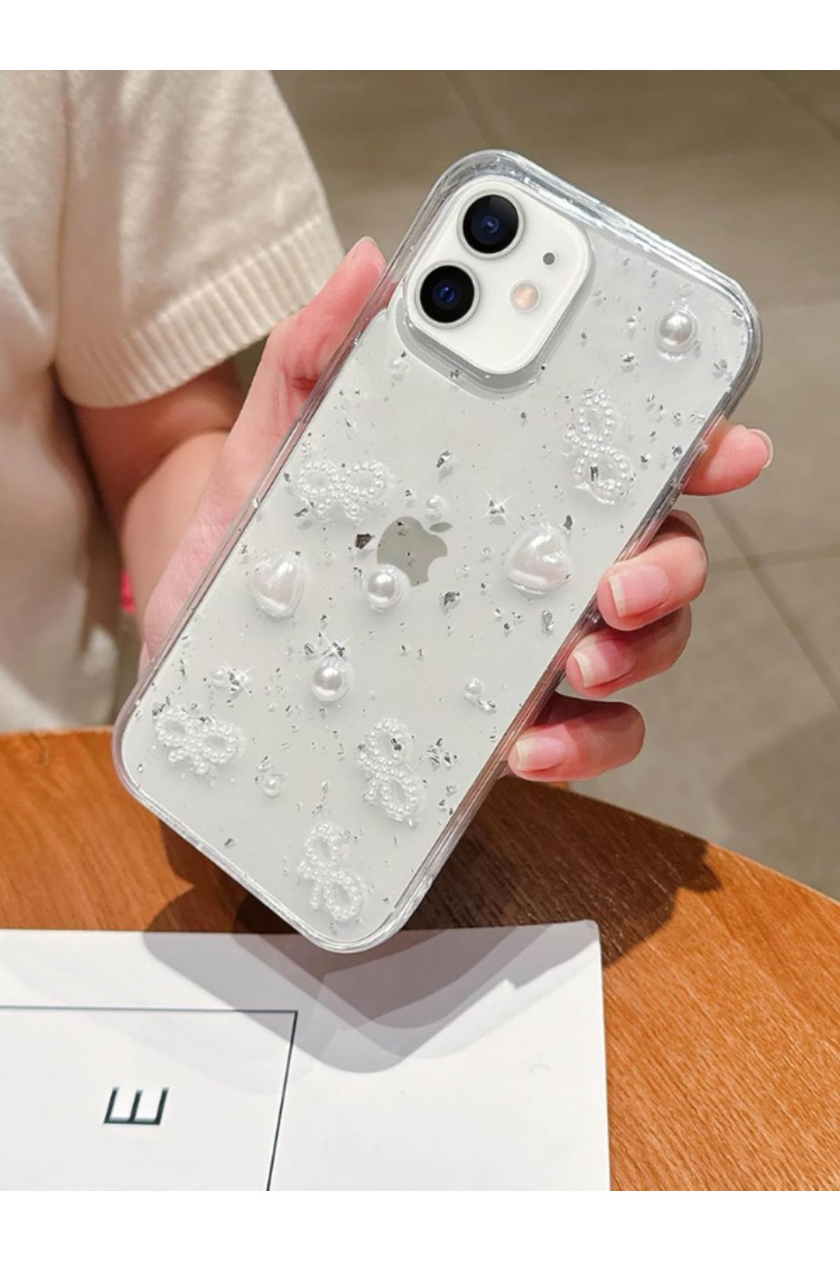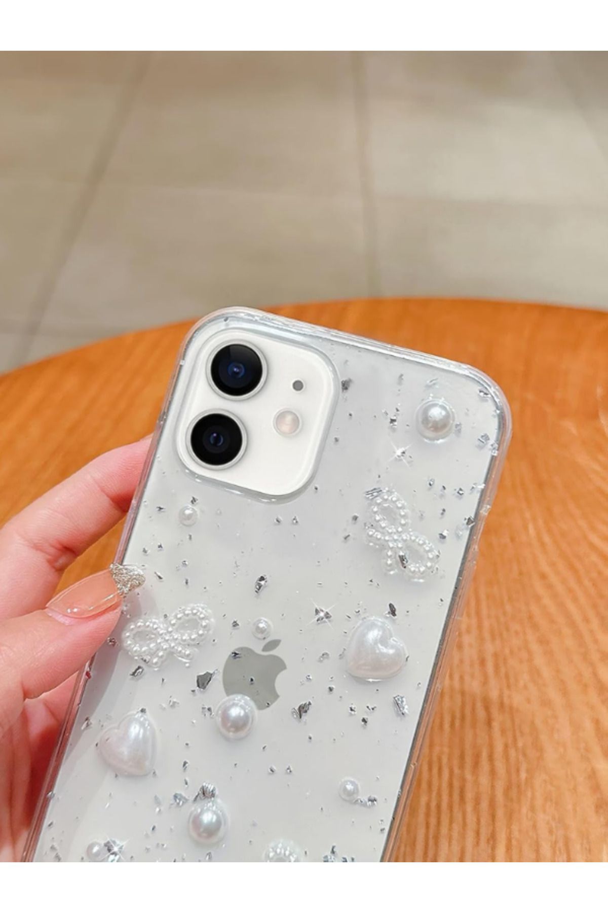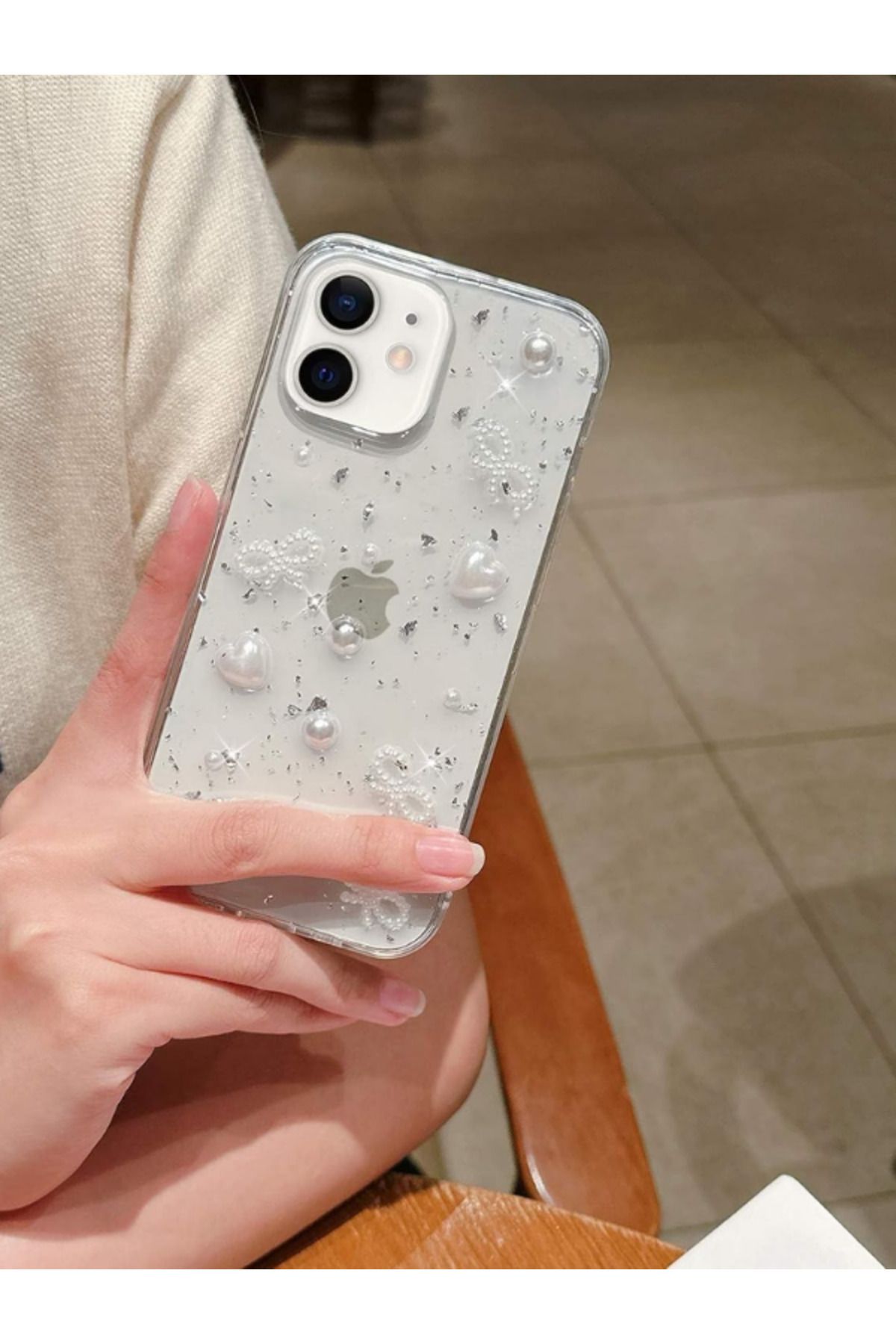 Apple iPhone 11 Uyumlu İnci Kalpli Fiyonk Şeffaf Kılıf Simli Darbeye Karşı Dayanıklı Kapak