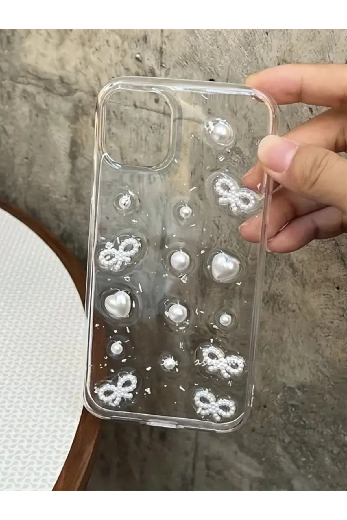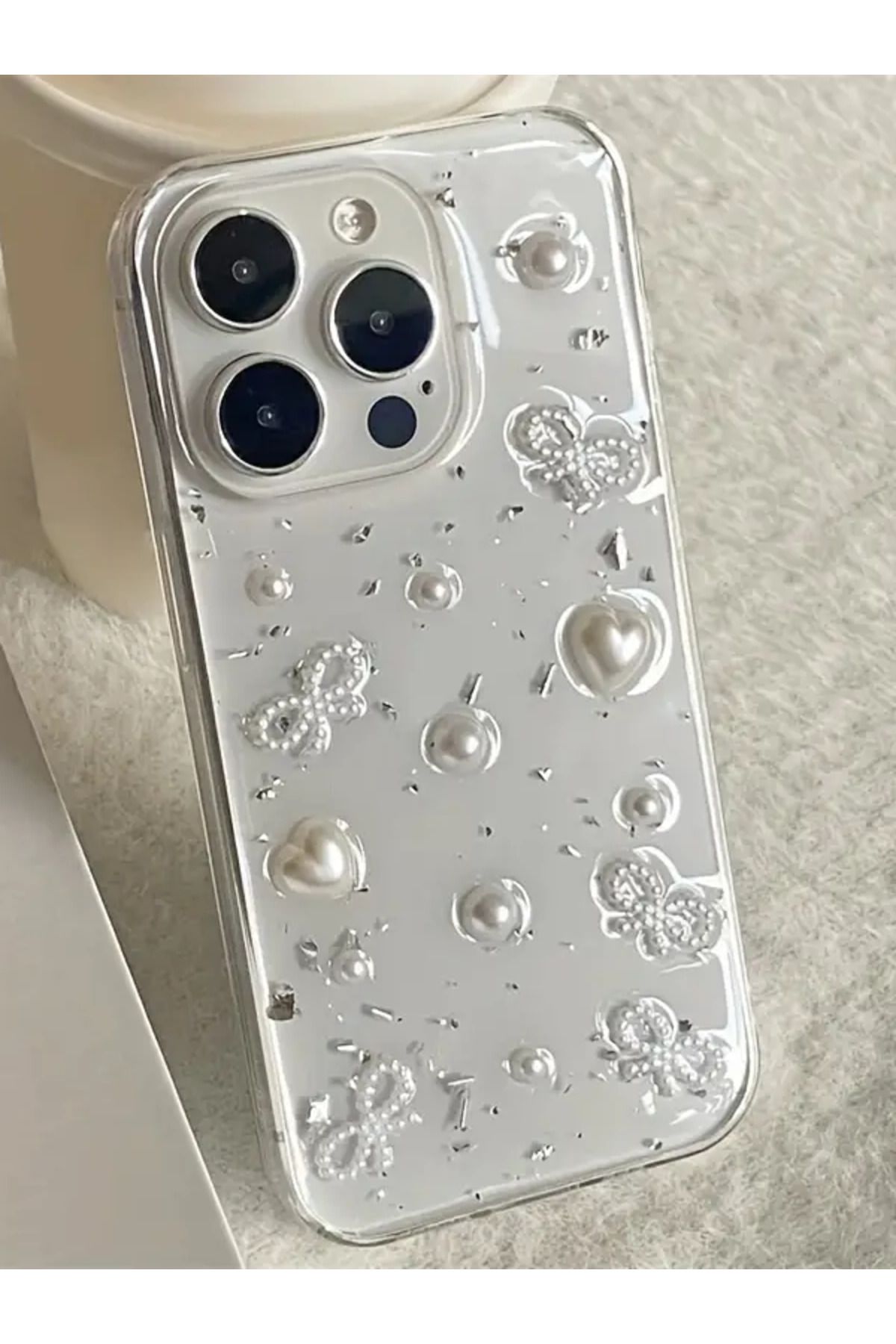 İnci Kalpli Fiyonk Şeffaf Kılıf Simli Darbeye Karşı Dayanıklı Kapak