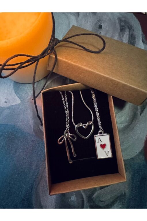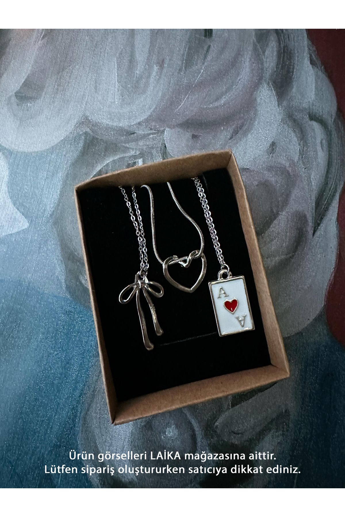 LAİKA Fiyonk-kalp-as Gümüş Renk 3’lü Çelik Zincirli Kolye Seti