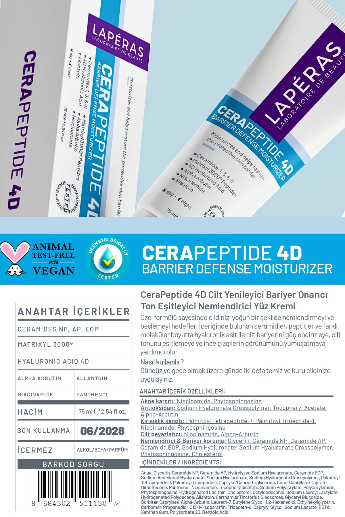 LAPERAS Su Bazlı Nemlendirici Krem 75ml | Cerapeptide 4d Seramid Peptit Hyaluron Bariyer Onarıcı