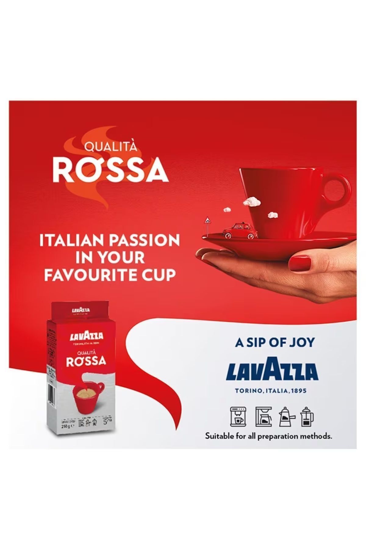 Tüm kahve çeşitlerinde kullanılabilen Lavazza Qualita Rossa Öğütülmüş Filtre Kahve, altın rengine sahip yoğun krema görünümü ile dikkat çeker.