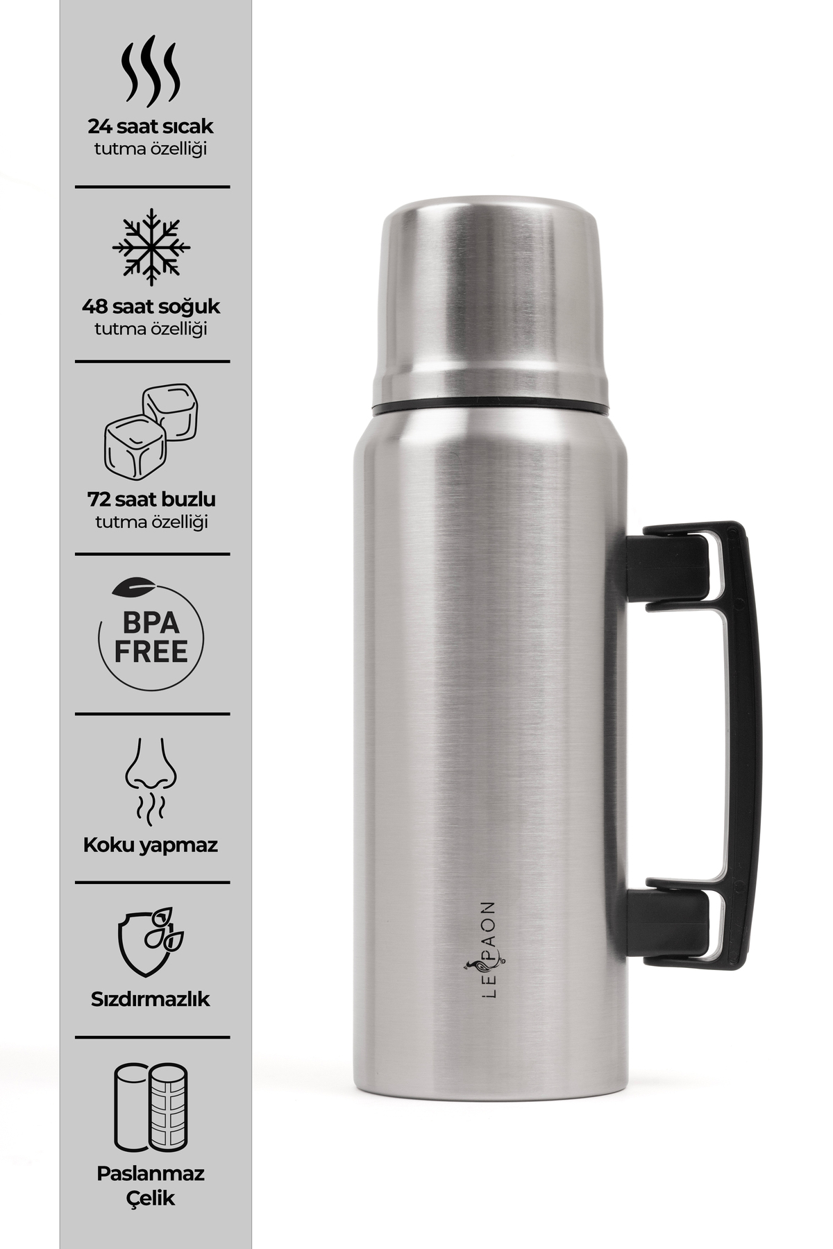 Le Paon 1 Lt. Paslanmaz Çelik Termos Katlanır Kulp Sızdırmaz 24 Saat Sıcak 48 Saat Soğuk BPA Free ürününü en uygun fiyata kozmetikara.com sitemizden sipariş verebilirsiniz.
