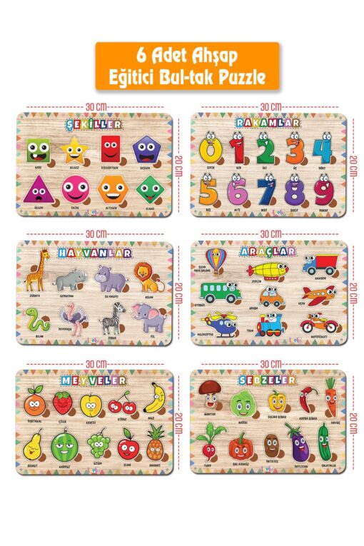 Leelii Tasarım Hayvanlar-Araçlar-Şekiller-Rakamlar-Meyveler-Sebzeler Ahşap 6’lı Set, Eğitici-Öğretici Yapboz