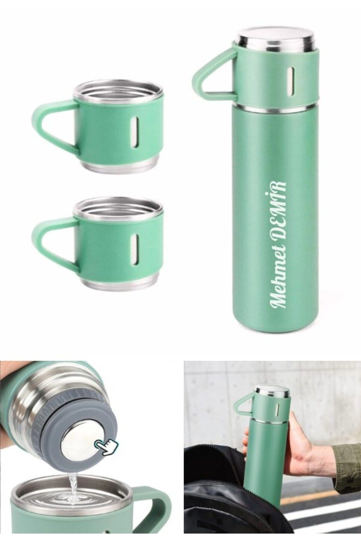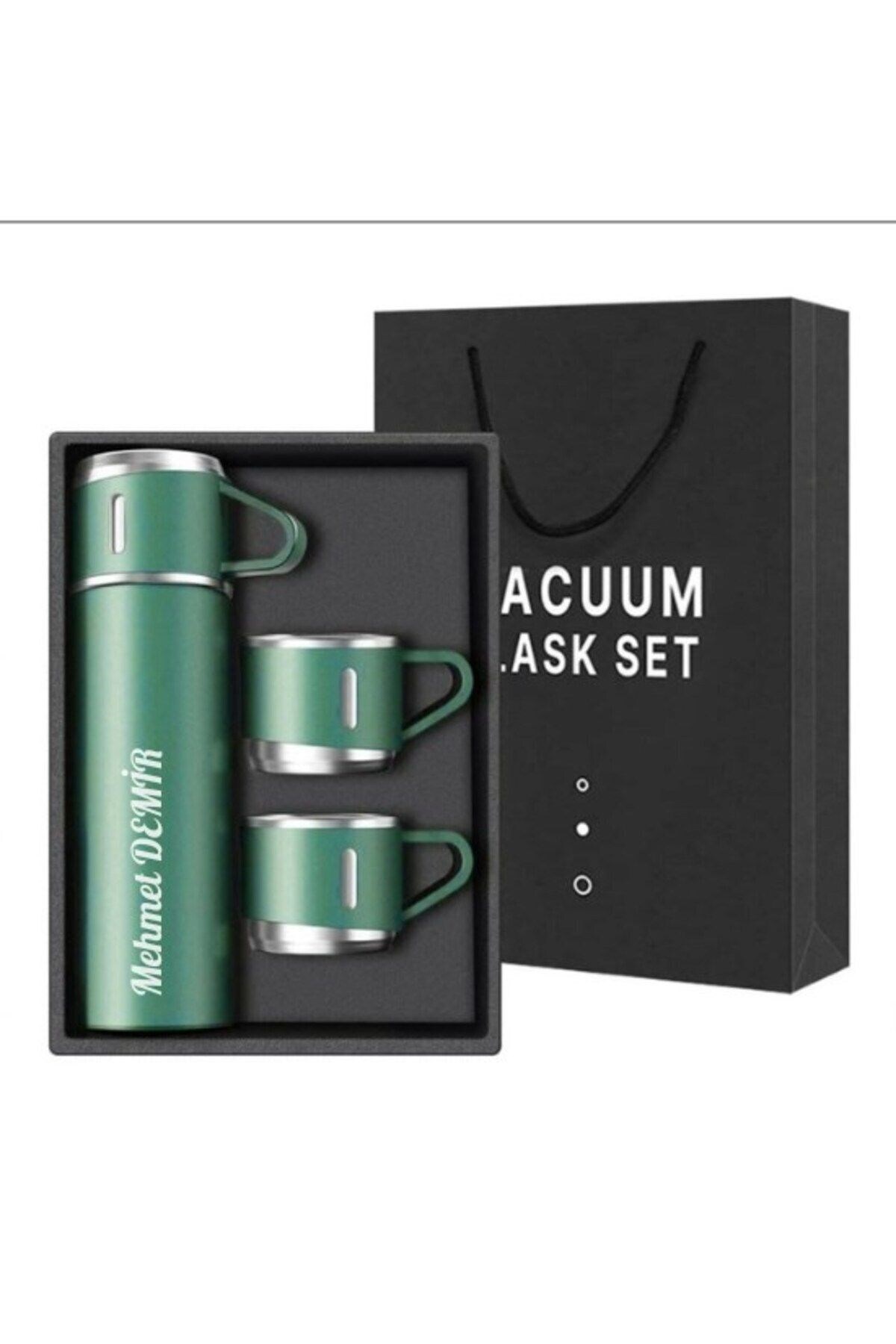 Lexi Bella İsime Kişiye Özel Hediye 3 Bardaklı Paslanmaz Çelik Vakumlu Kahve Sıcak Soğuk Kamp Termos Seti Yeşil