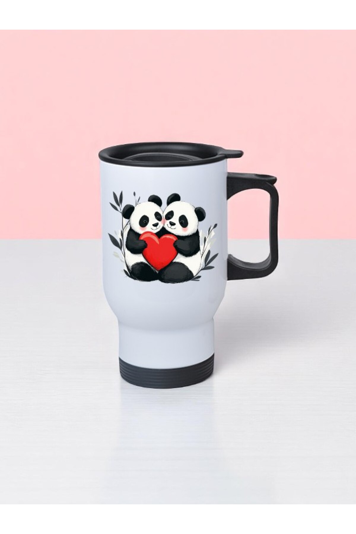 lili hediyelik Kalpli Panda Baskılı Kulplu Çelik Bardak Termos 450 ml