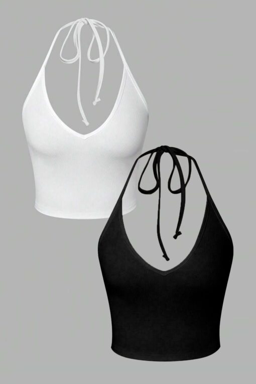 Liona 2 Li Paket V Yaka Siyah Beyaz Renk Desensiz Fitilli Kolsuz Boyun Askılı Likralı Fit Crop Top Bluz