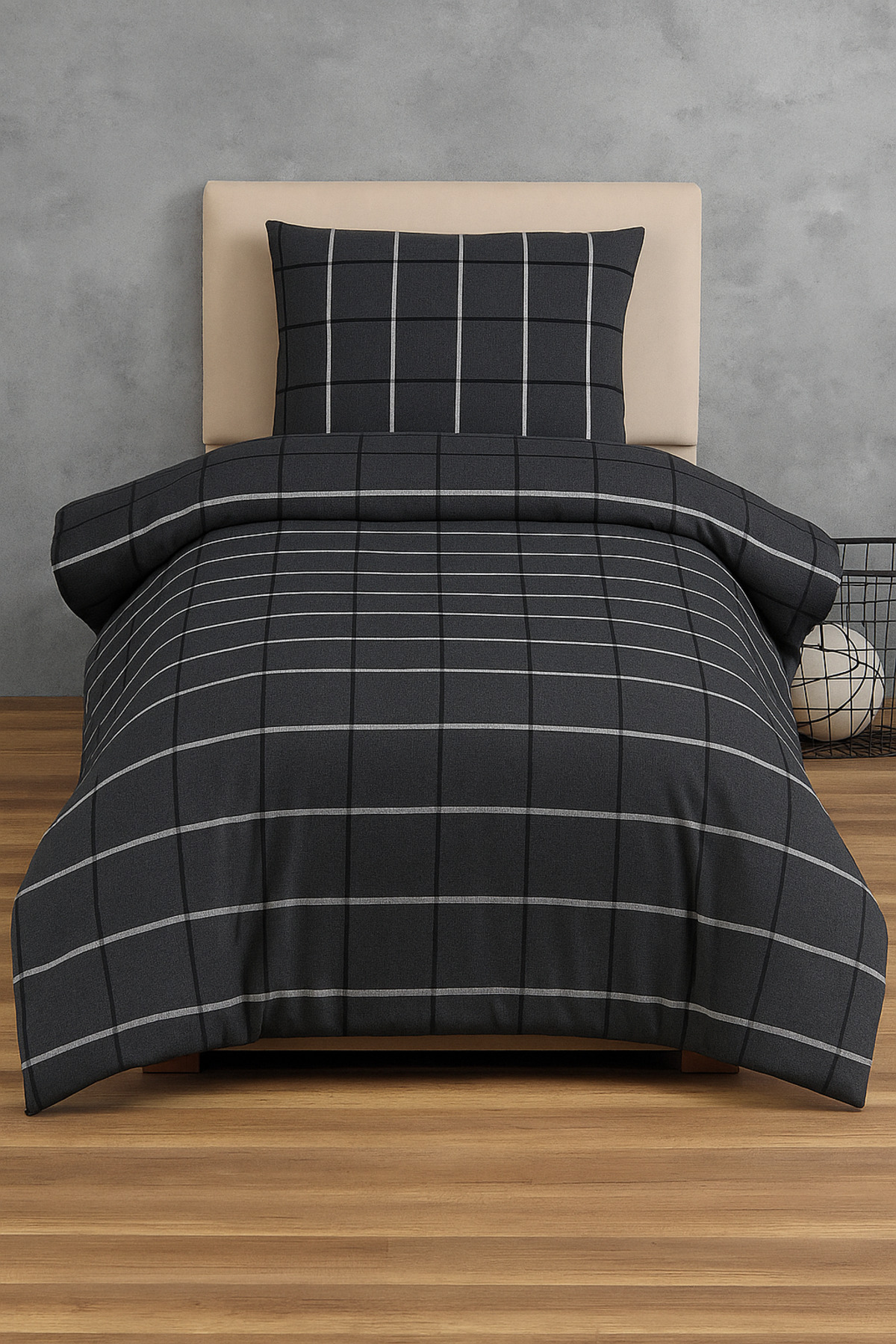 Lotusline Home Minikaro Füme Tek Kişilik Pamuklu Nevresim Seti Çift Taraflı