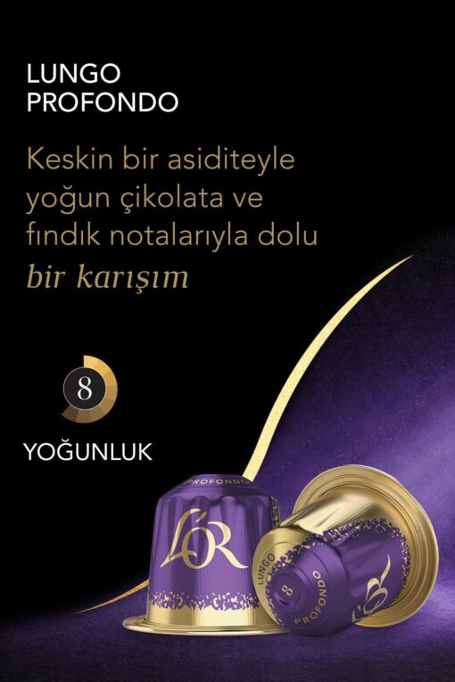L’OR – Espresso Kahve – Lungo Profondo – Core-Lungo Collection – Yoğunluk 8 – Bitter Çikolata ve Meyvemsi Notalar – 1 paket x 10 alüminyum kapsül KAKAO NOTALARI ile kuru erik ve kuru üzümün meyvemsiliğinin birbirine oluşturduğu tezat.