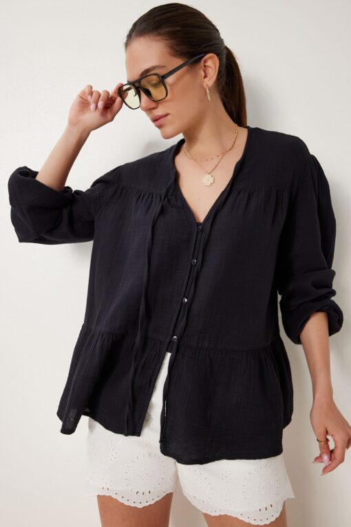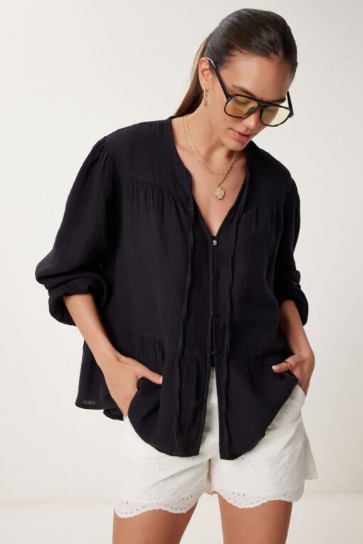 Lovelyİstanbul Bağlama Detaylı Müslin Gömlek SİYAH LMX0076