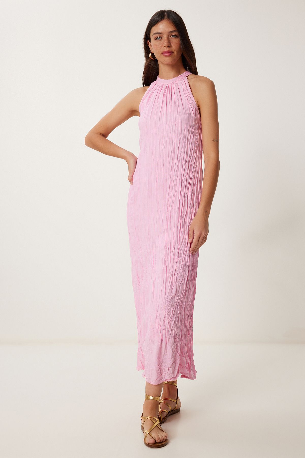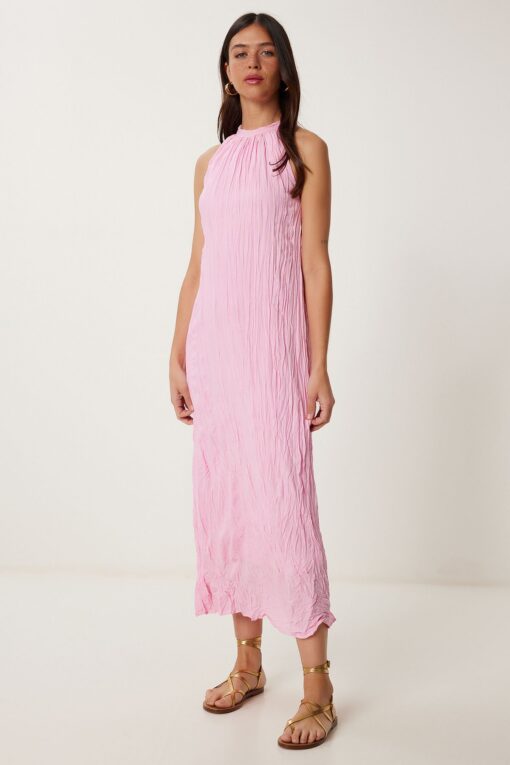 Lovelyİstanbul Kırışık Efektli Yazlık Keten Elbise PEMBE LGK0005