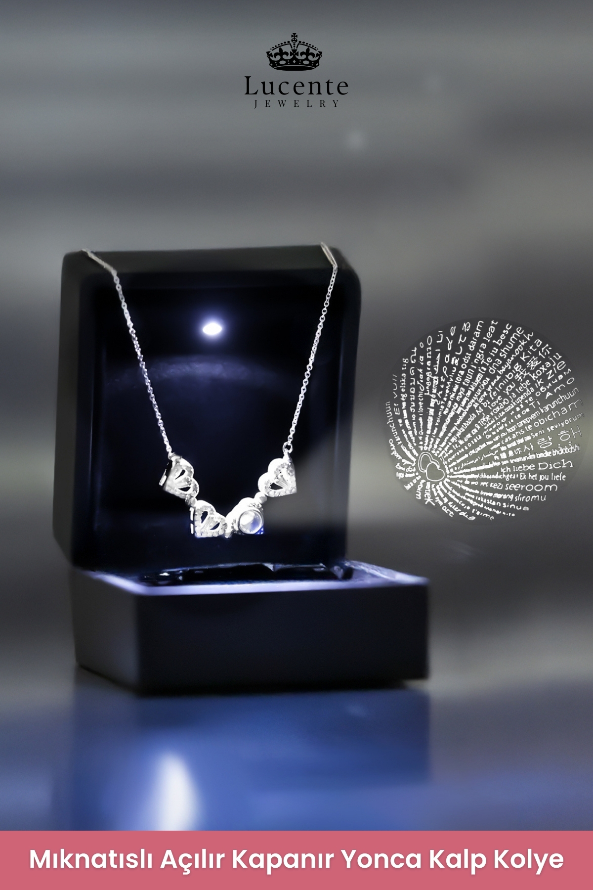 Lucente Jewellery Işıklı Hediye Kutulu 100 Dilde Seni Seviyorum Özel Tasarım 925 Ayar Gümüş Kaplama Aşk Yonca Kolye