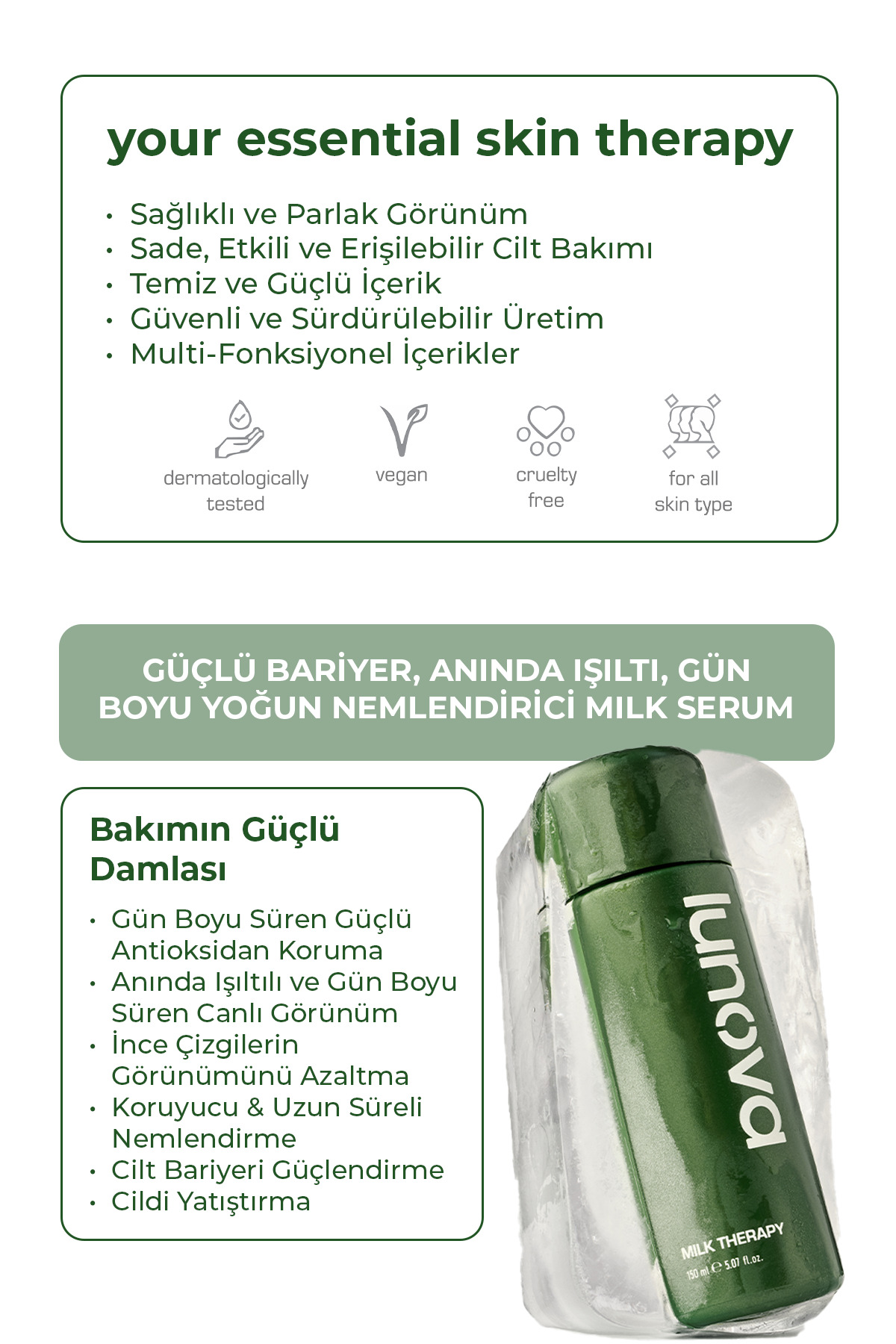 Lunova Milk Therapy Serum 150 ML | Yoğun Nem, Bariyer Güçlendirme, SPF ve Makyaj Bazı Serum ürünü ucuz fiyat, hızlı kargo imkanı ile hemen sitemizden sipariş verin.