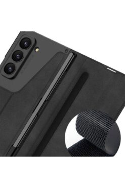 m.tk moveteck Samsung Galaxy Z Fold 6 Kılıf Kıpta Standlı S Pen Kalem Bölemli Yuvalı Kartlıklı Cüzdanlı Kadife 360