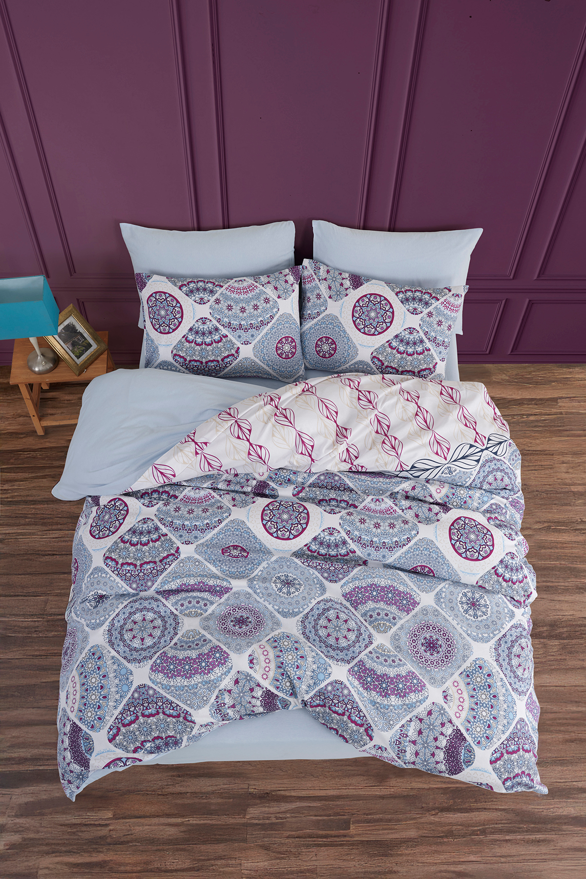 İQON Lastikli Çarşaflı Nevresim Takımı Çift Kişilik Blossom Mavi