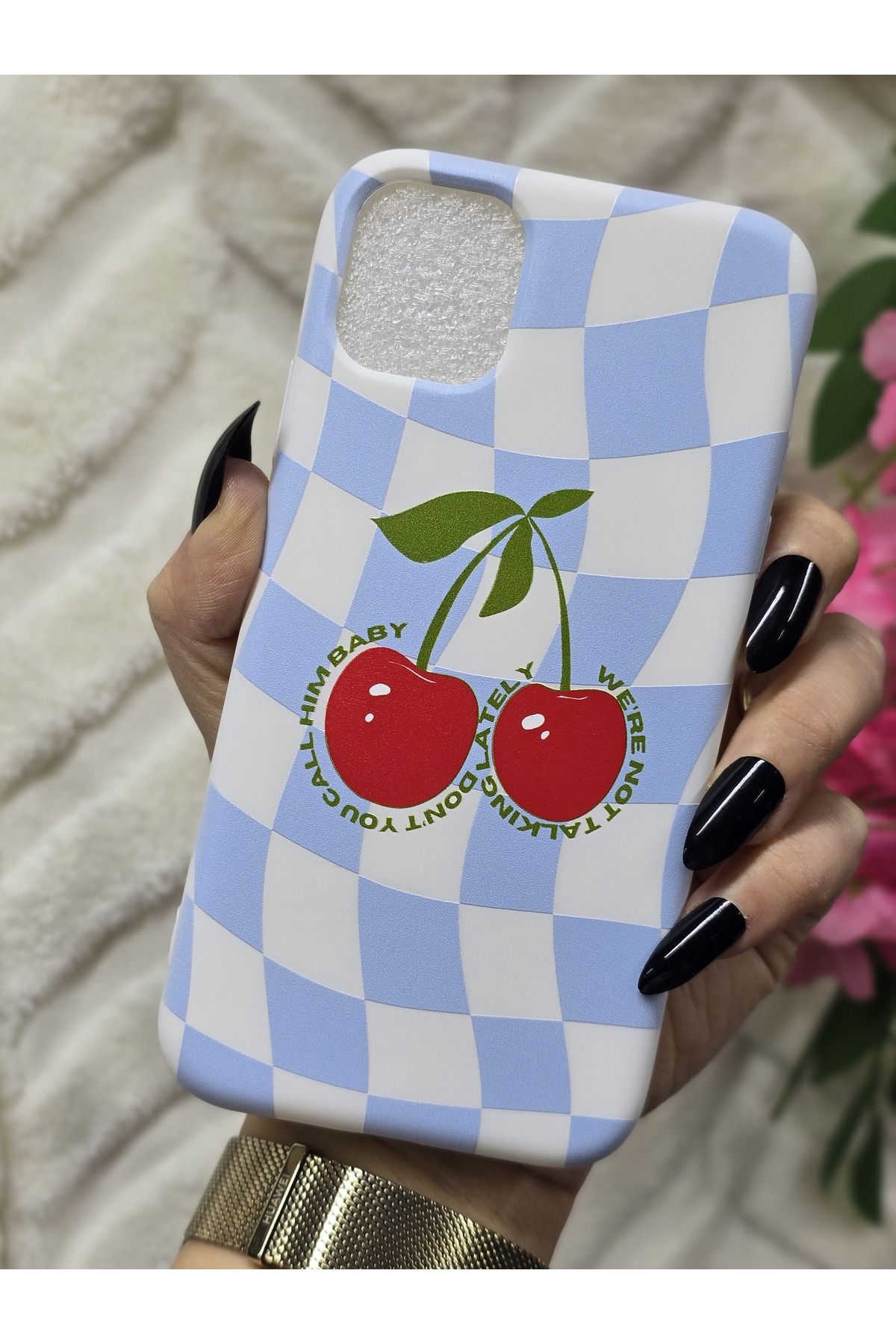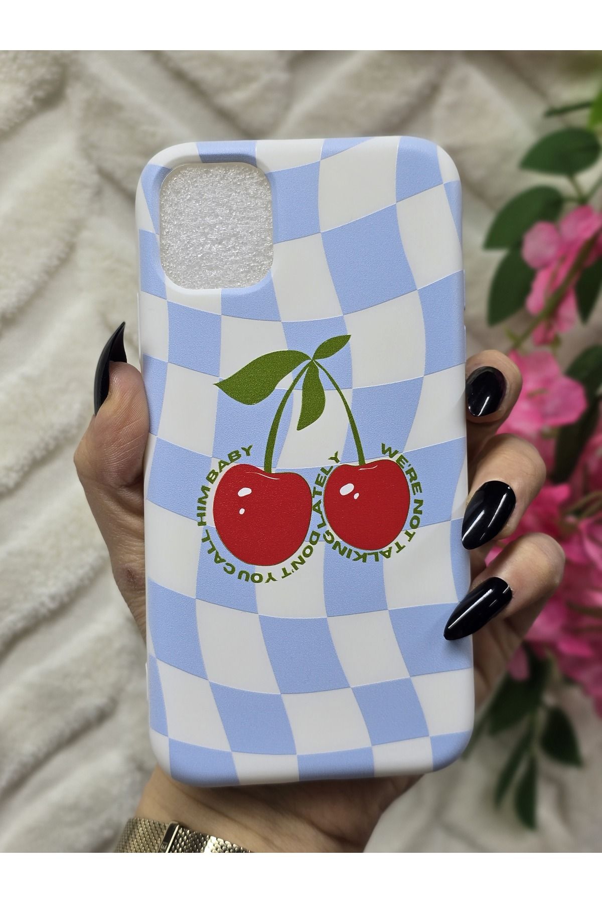 Magic Ring İphone 11 Telefon Kılıfı – Mavi Ekose Desenli, Kiraz Baskılı Soft Silikon Içi Kadife Lansman