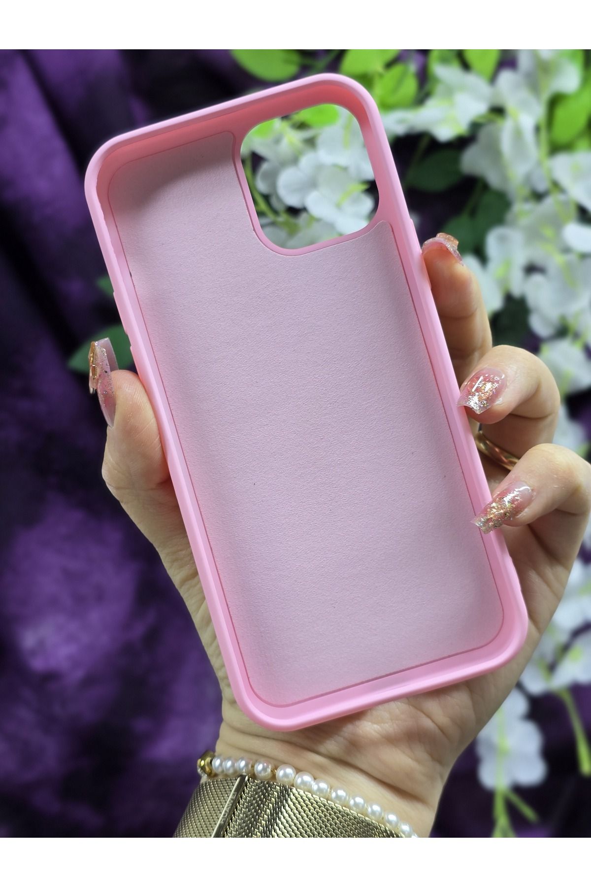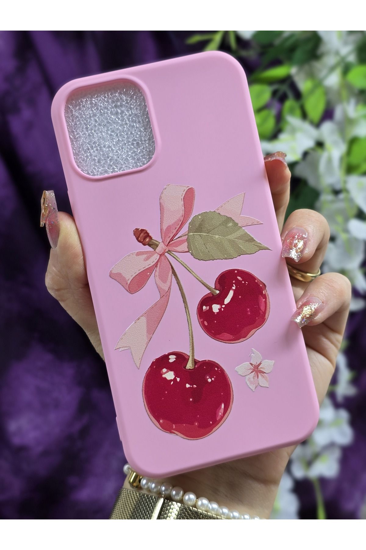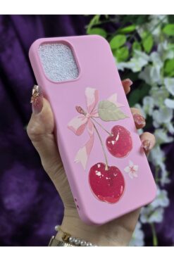 – iPhone 12 ve iPhone 12 Pro modellerine özel tasarlanmış, telefonunuzu şık bir şekilde koruyan kiraz ve kurdele desenli pembe telefon kılıfı.