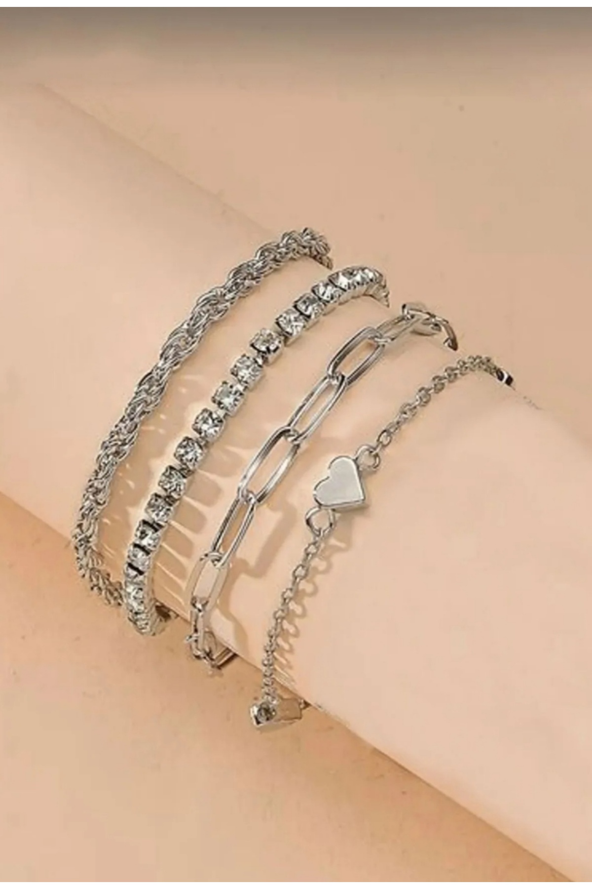 MAKSESUAR Kadın 4’lü Kalp Detaylı Bileklik Seti ( Lastik Toka Hediyeli)