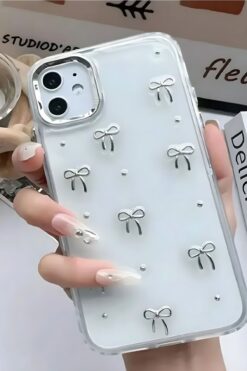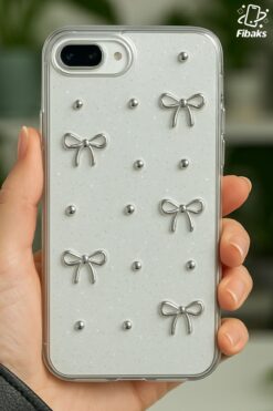 Fibaks Apple iPhone 7 / 8 Plus Kılıf Fiyonk Desenli Şeffaf Simli Gümüş Kamera Çıkıntılı Parlak Kapak