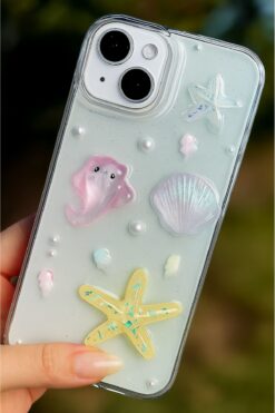 Fibaks Apple iPhone 13 – 14 – 15 Kılıf Şeffaf Simli Deniz Yıldızı Vatoz Deniz Kabuğu Desenli Silikon Kapak