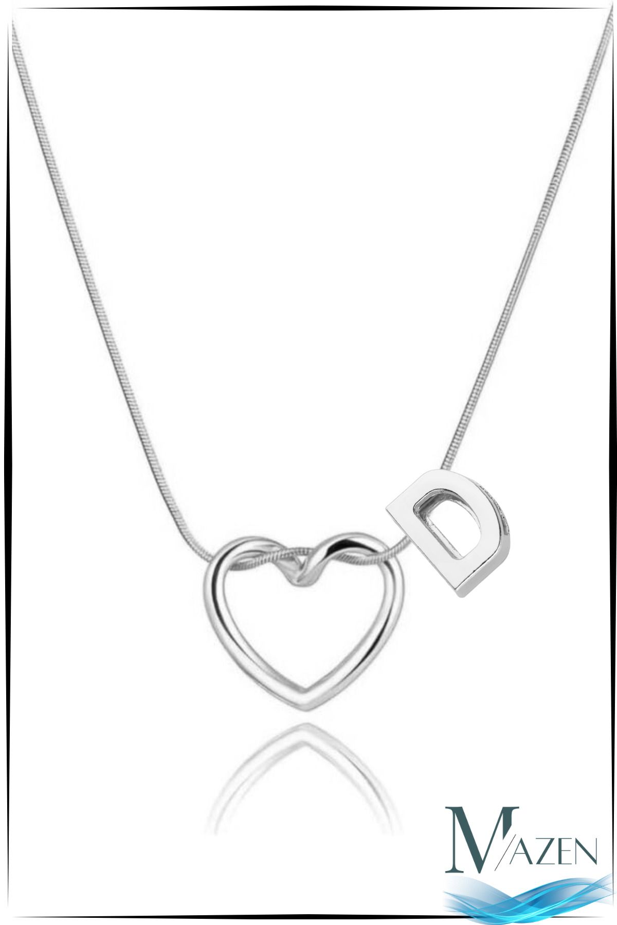 MAZEN Gümüş Renk Kalpli Harf Detaylı Kolye – Kararmaz Cerrahi Çelik – D Harfi