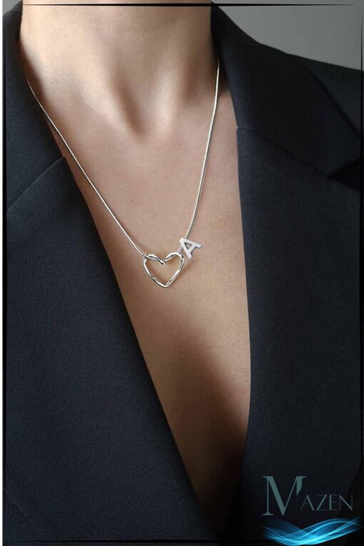 MAZEN Gümüş Renk Kalpli Harf Detaylı Kolye – Kararmaz Cerrahi Çelik – R Harfi